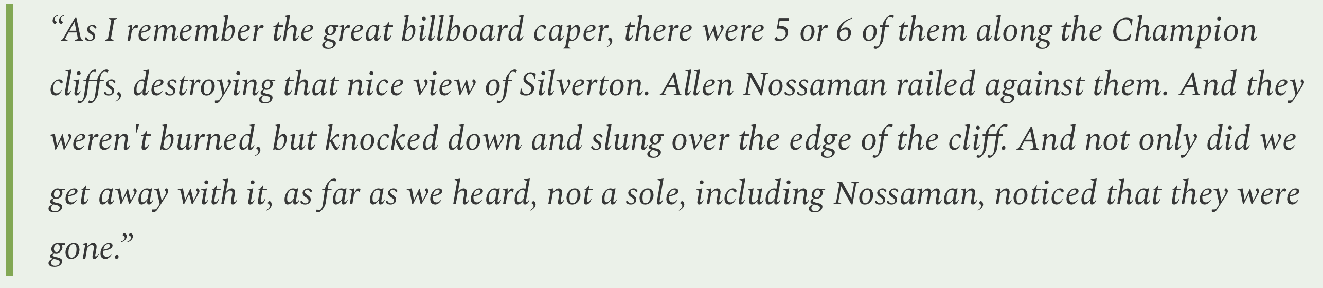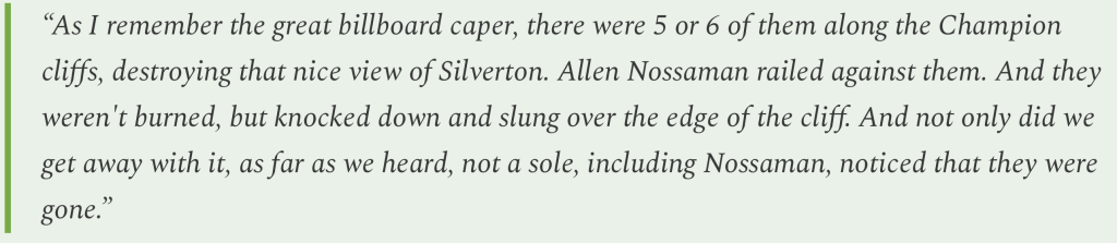 Remember the Monkeywrenching essay I wrote last week? I have been informed by a very reliable source, eyewitness, and possible accomplice â who will remain anonymous, of course â that I was wrong about my father and companions burning a single billboard near Silverton. Hereâs how it really unfolded: