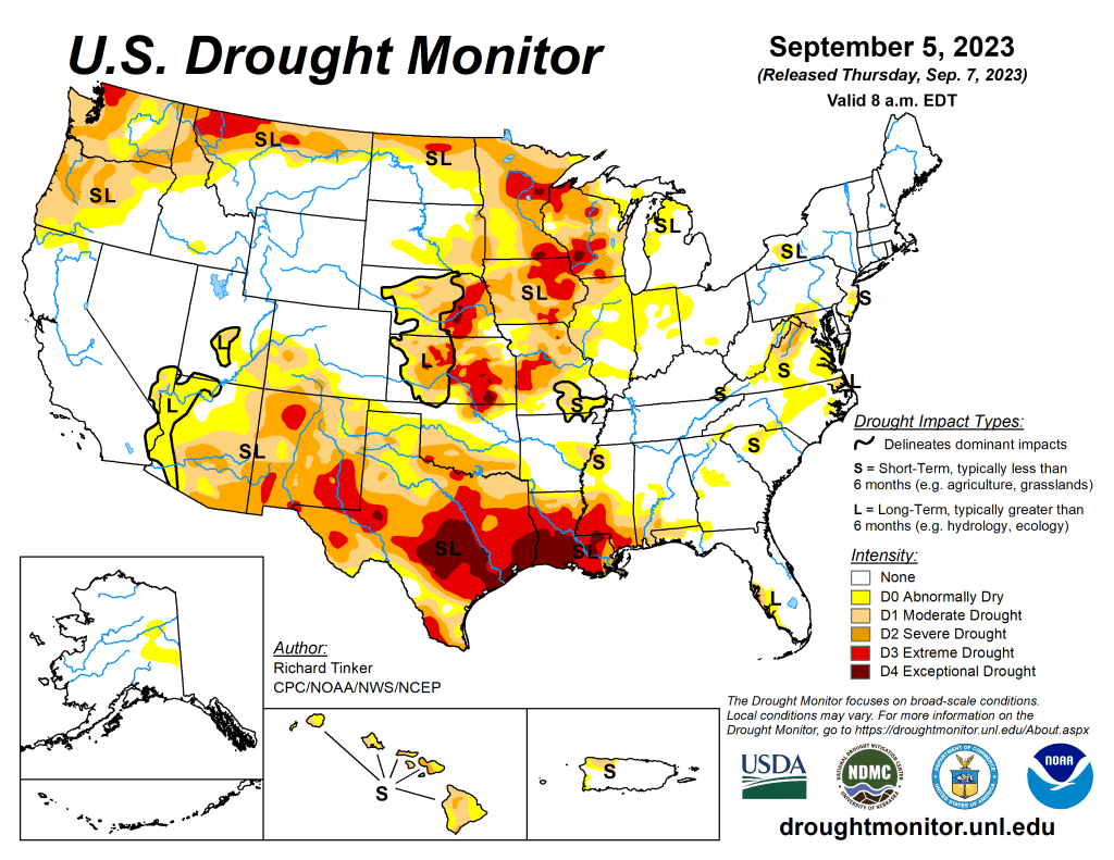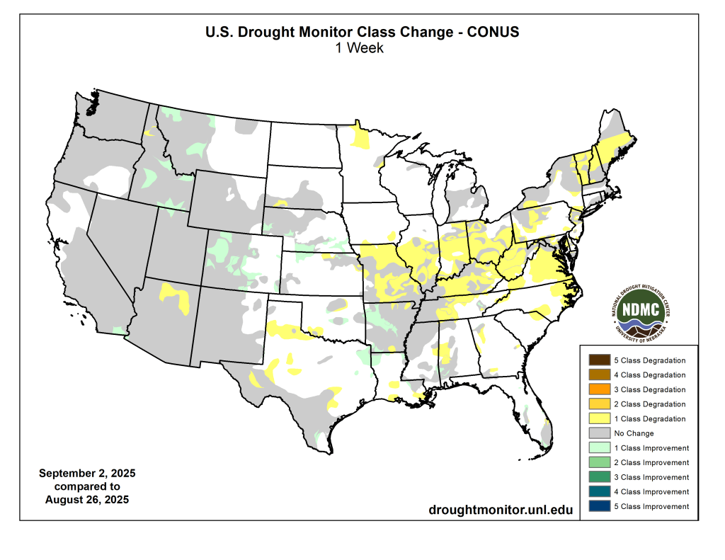 This U.S. Drought Monitor (USDM) week saw widespread degradation in drought-related conditions across areas of the Midwest, Mid-Atlantic, and Northeast where precipitation during the past 30-day period has been below normal. In these areas, rainfall deficits ranged from 3 to 5 inches with the largest deficits observed across areas of New England and Lower Midwest. Elsewhere, short-term dryness and drought impact reports from the agricultural sector led to degradations in isolated areas of the Southeast and South. For the week, most of the eastern half of the conterminous U.S. experienced unseasonably cooler temperatures, while temperatures out West were above normal, especially across the Pacific Northwest and Desert Southwest. In the West, conditions were generally dry, however, some isolated monsoon thunderstorm activity was observed in the Southwest, Sierra Nevada Range of California, Great Basin, and in the Rocky Mountains. In the Pacific Northwest, continued dryness as well as declining streamflow and soil moisture levels led to expansion of areas of exceptional drought in the Idaho Panhandle. In terms of reservoir storage in the West, California’s reservoirs continue to be at or above historical averages for the date (September 2), with the state’s two largest reservoirs, Lake Shasta and Lake Oroville, at 104% and 112% of average, respectively. In the Southwest, the U.S. Bureau of Reclamation is reporting (September 1) Lake Powell at 29% full (44% of average for the date), Lake Mead at 31% full (52%), and the total Colorado system (September 1) at 38% of capacity (compared to 44% of capacity the same time last year)…