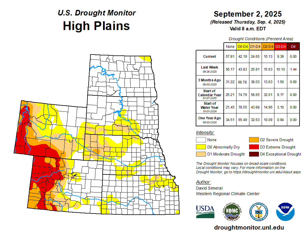 On this week’s map, improvements were made in the region, namely in northern Kansas, and southern Nebraska, where some isolated shower activity (1 to 5+ inches) during the past week continued to help chip away at the longer-term precipitation deficits. For the past 60-day period, the Lincoln AP observed its 6th wettest on record with 10.24 inches (+3.69 departure from normal), according to the SERCC. Conversely, conditions deteriorated on the map in the southwestern extent of South Dakota where a combination of short and long-term precipitation deficits have persisted leading to expansion of areas of Moderate Drought (D1). For the week, above-normal temperatures (ranging from 2 to 10 degrees F) were logged across northern North Dakota, while much of the remainder of the region experienced below normal temperatures (ranging from 1 to 10 degrees F), especially in the southern extent of the entire region…