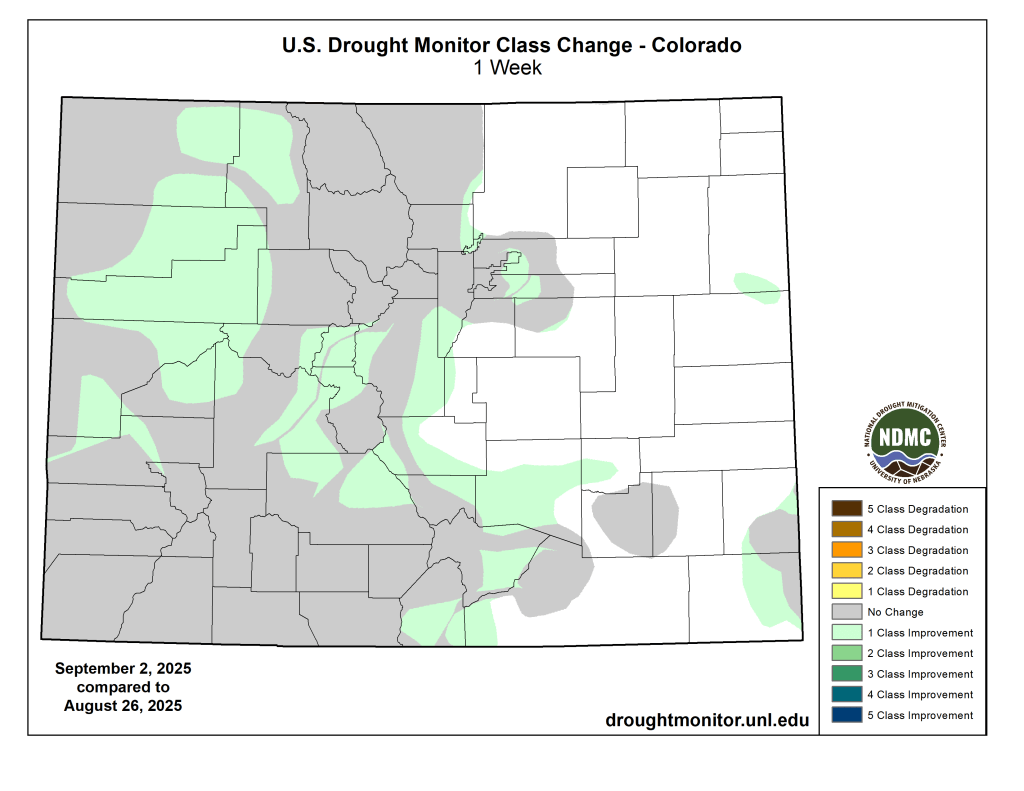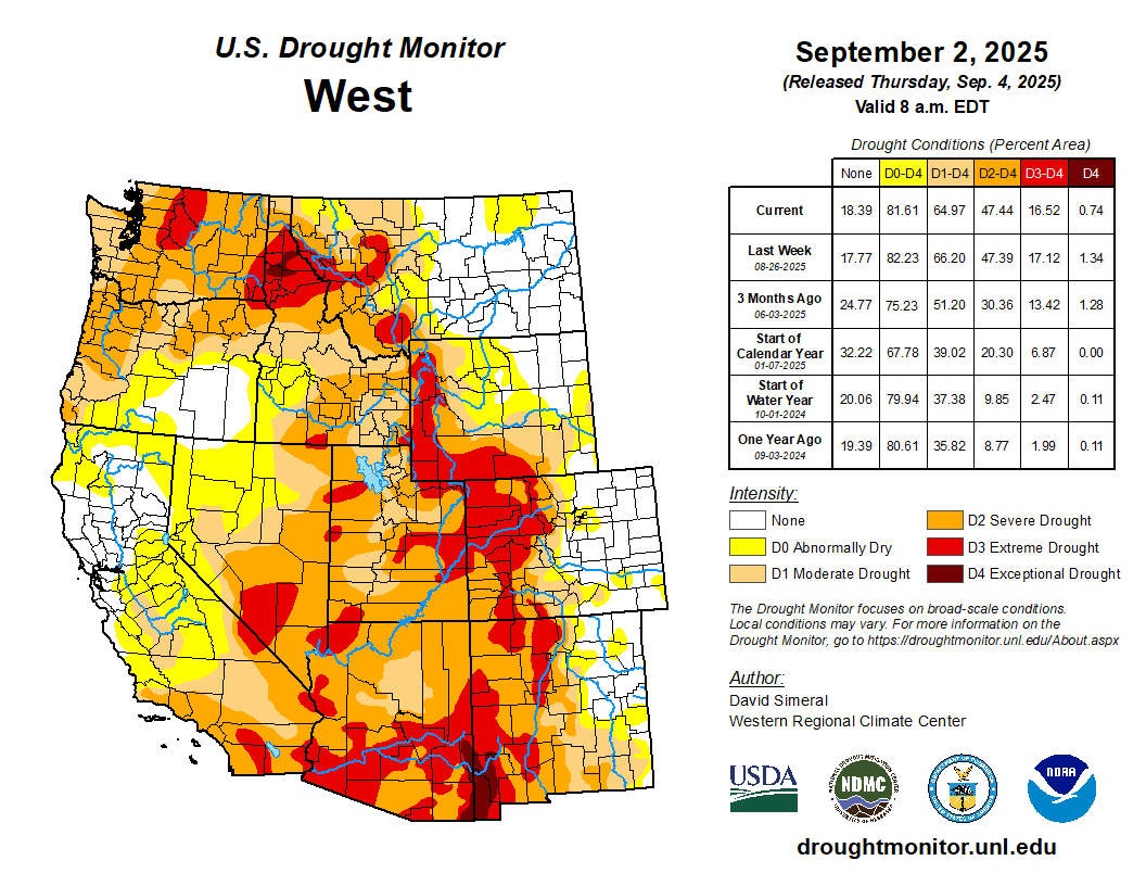 Out West, some isolated monsoon shower activity was observed across areas of the Desert Southwest, Sierra Nevada, and Great Basin as well as areas of the central and northern Rockies. Improvements were made on the map in Colorado, western Montana, southern Idaho, northern Utah, and southeastern California, while some degradations were made in north-central Arizona where monsoon-season precipitation has been below normal. According to the National Weather Service in Tucson, 2025 monsoon rainfall has been below normal across much of the state including Flagstaff, Phoenix, and Tucson. Conversely, a more active monsoon season has affected areas of New Mexico including southern and eastern portions of the state. For the week, average temperatures were below normal across areas of eastern California, central Great Basin, and areas of the Intermountain West including Utah, Colorado, and southern Wyoming where temperatures were 5 to 10 degrees below normal. In the Pacific Northwest, temperatures were above normal with anomalies ranging from 2 to 15 degrees F and the greatest departures observed in eastern Washington, Idaho Panhandle, and northwestern Montana…
