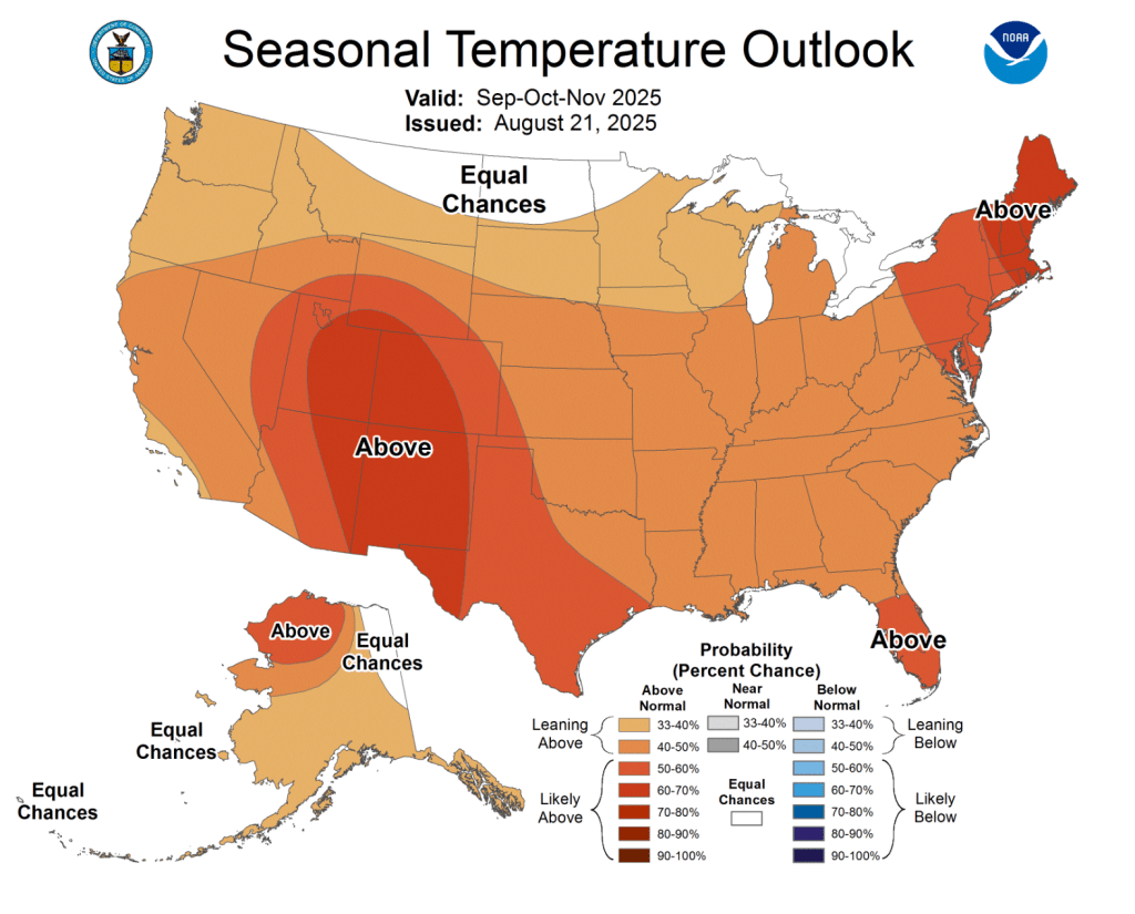 Current eastern Pacific Ocean temperatures are near average, and ENSO remains in a neutral condition. ENSO-neutral conditions are the most likely outcome for the beginning of the 2026 water year and through winter 2026. The probability of La Niña conditions increases to 40% in late fall to early winter, but the probability of La Niña decreases for the remainder of winter 2026. The NOAA Monthly Precipitation Outlook suggests equal chances for above or below average precipitation for September except in southeastern Colorado where there is an increased probability of above average precipitation. The NOAA Seasonal Outlooks for September-November suggest and increased probability of below average precipitation and above average temperatures for the entire region.