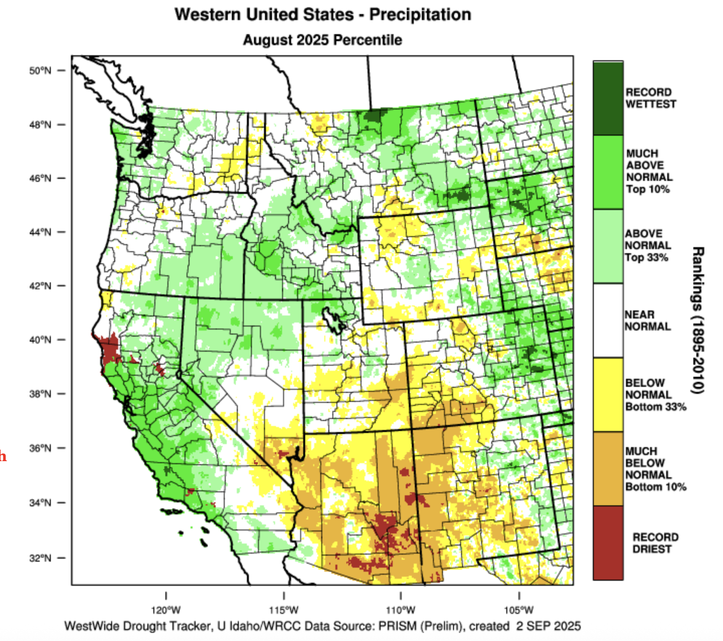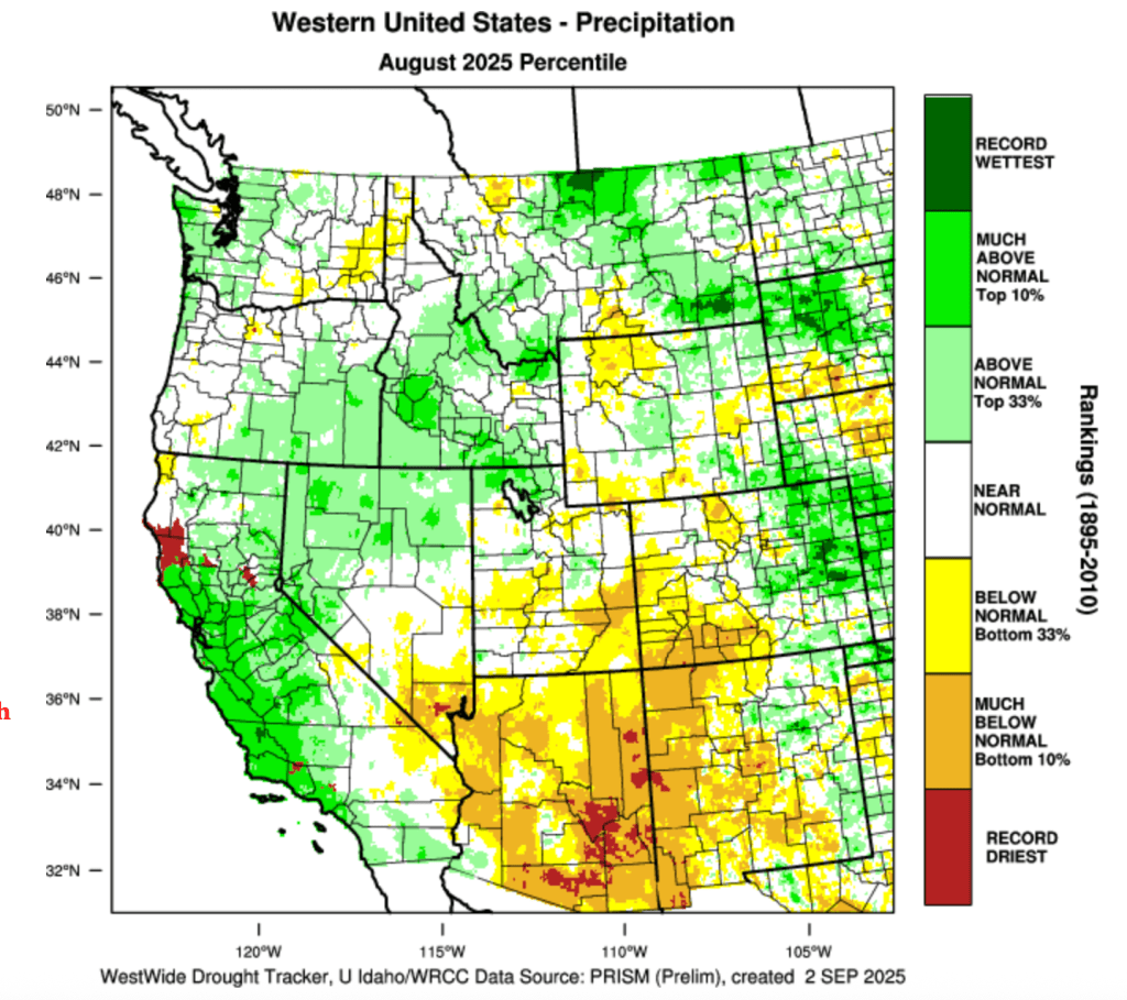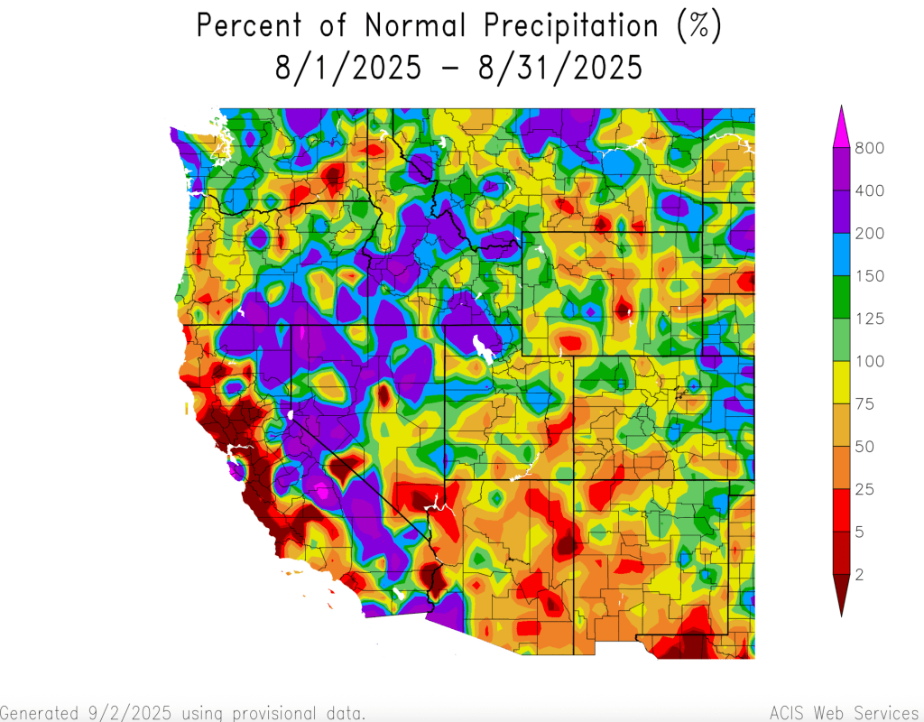 After an extremely dry July, August was somewhat wetter with monthly precipitation near to above average for many regional locations. Portions of eastern Colorado and northern Utah received greater than 150% of average August precipitation while portions of Wyoming received up to 150% of average August rainfall. The Four Corners region of Colorado and Utah remained dry with August precipitation at less than 75% of average.