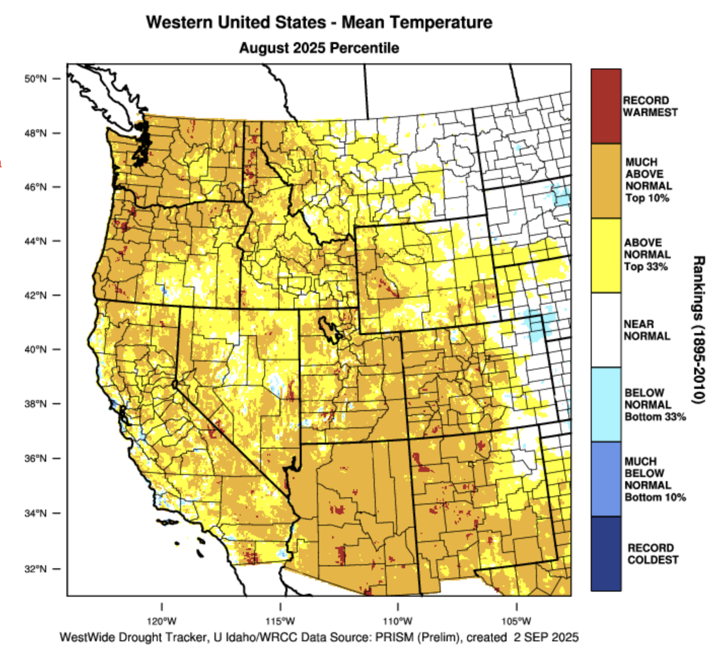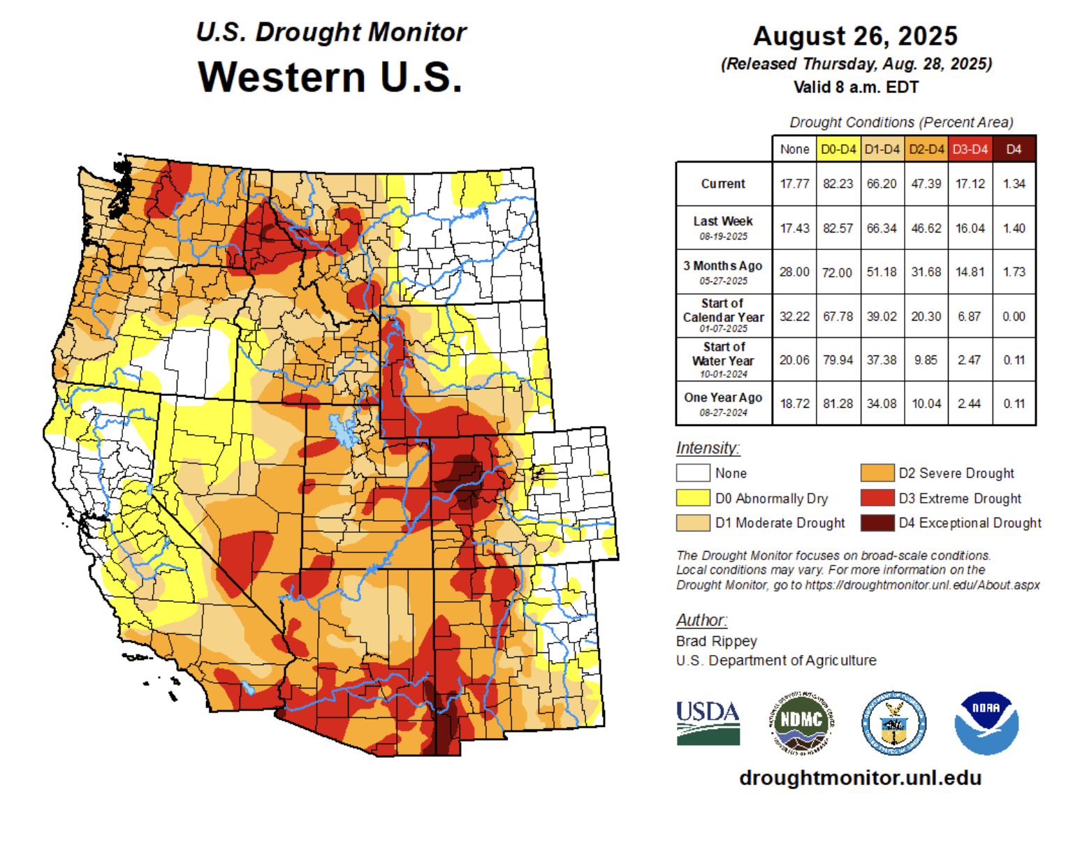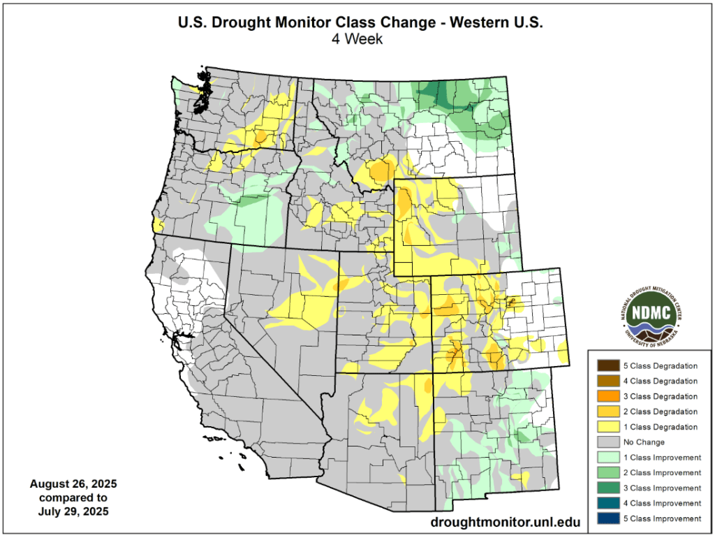 Drought conditions worsened in Colorado, Utah and Wyoming west of the Continental Divide while drought is mostly absent east of the Divide. Overall coverage of drought expanded to cover 67% of the region (up from 62% on 7/29); the entirety of Utah remains in drought, and drought coverage expanded in both Colorado and Wyoming. The headline drought story during August was the expansion of extreme (D3) drought conditions in western Colorado, eastern Utah and western Wyoming, and the emergence of exceptional (D4) drought in western Colorado. Portions of western Colorado and western Wyoming observed a two-category degradation of drought conditions during August.