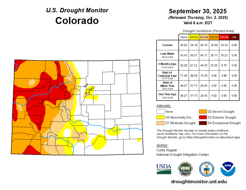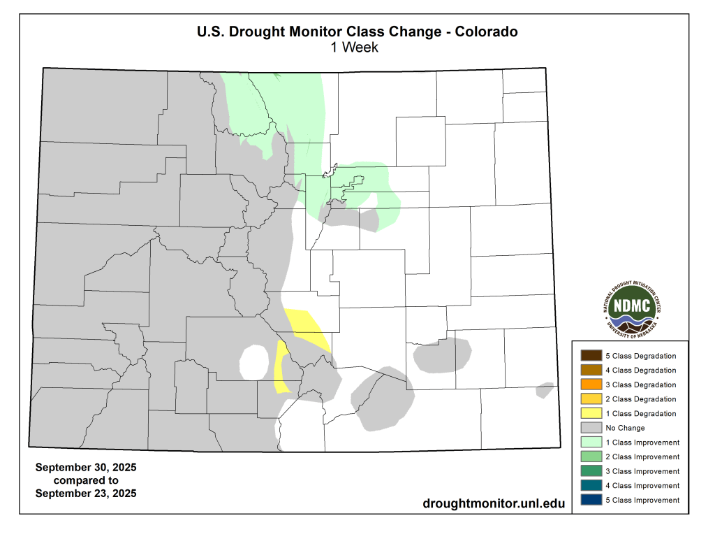Mostly warmer-than-normal temperatures occurred across the High Plains this week, except for central and southern parts of Colorado. The Dakotas and northern Wyoming were especially warm as September reached its end, with temperatures mostly 6-10 degrees above normal. Widespread moderate to heavy precipitation fell from southwest Nebraska and northwest Kansas into northern Colorado and southeast Wyoming, including some wintry precipitation at higher elevations. Rainfall amounts locally exceeded 2 inches in parts of northeast Colorado and adjacent parts of Nebraska and Kansas.