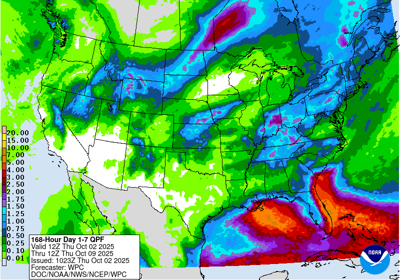 Between the evening of Wednesday, Oct. 1 and Monday, Oct. 6, the National Weather Service Weather Prediction Center is forecasting mostly dry weather across large portions of the Contiguous U.S., spanning from southern California east and northeast through the Ohio Valley, eastern Great Lakes and Northeast. Outside of the Southeast, precipitation amounts of at least 0.75 inches are confined to parts of the Sierra Nevada, northern Nevada, northern Utah, parts of Idaho, northern Wyoming, southern Montana, western South Dakota and central North Dakota. Heavier rain amounts are forecast in parts of southeast Louisiana and the Mississippi Gulf Coast, far southern South Carolina, far southeast Georgia and much of the Florida Peninsula. In the Florida Peninsula and far southeast Louisiana, rainfall amounts may exceed 4 inches.