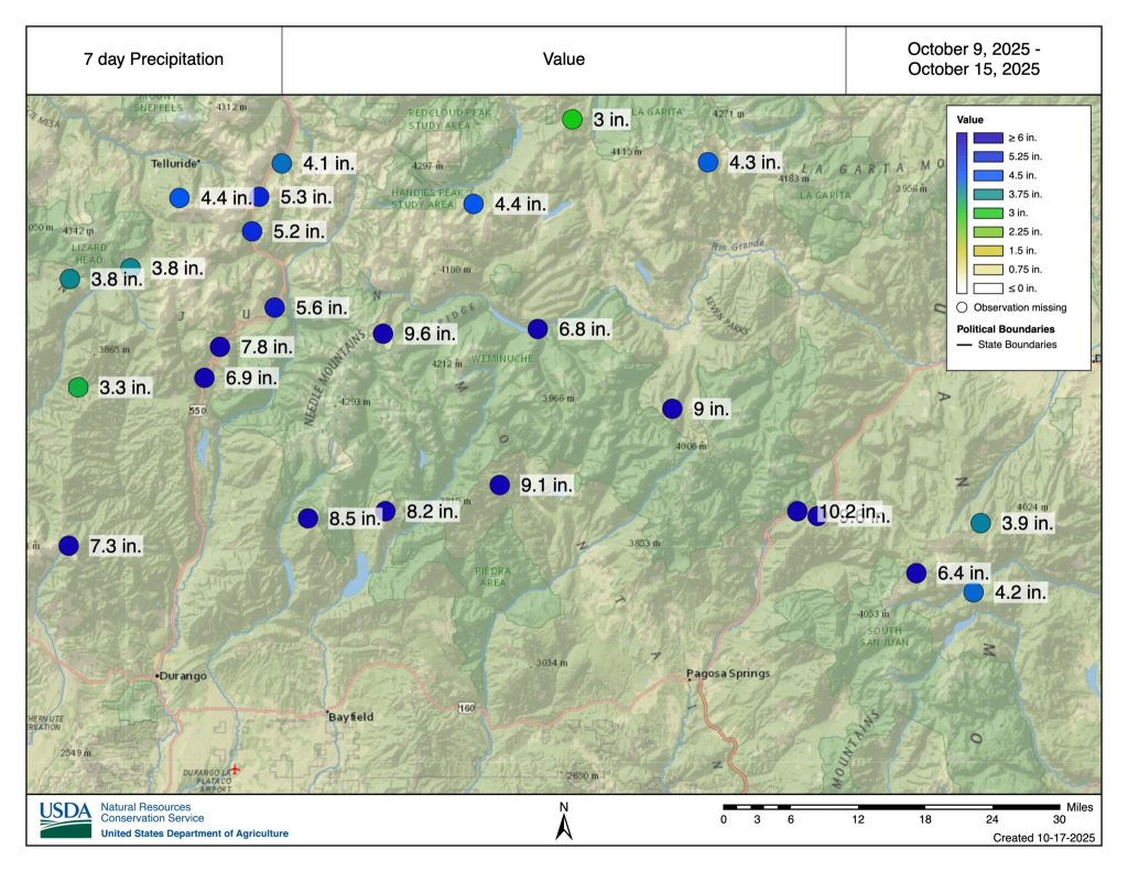 7-day precipitation at southwestern Colorado SNOTEL stations from 9-15 October 2025. From the USDA NRCS interactive map
