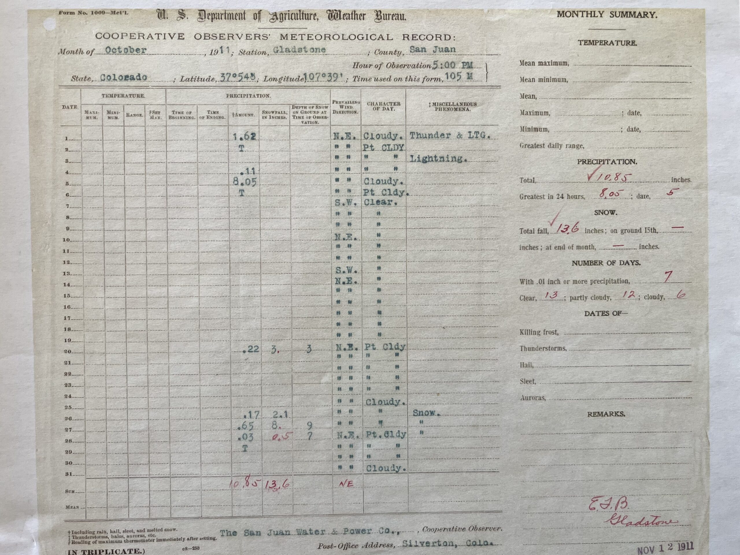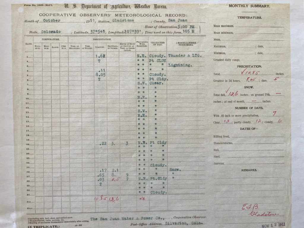 Photo of the cooperative observer form from Gladstone, Colorado, October 1911.