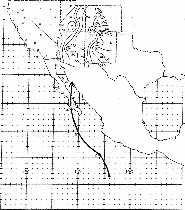 Track of the October 1911 hurricane, along with rainfall measurements in the southwestern US. From the National Weather Service report “THE EFFECTS OF EASTERN NORTH PACIFIC TROPICAL CYCLONES