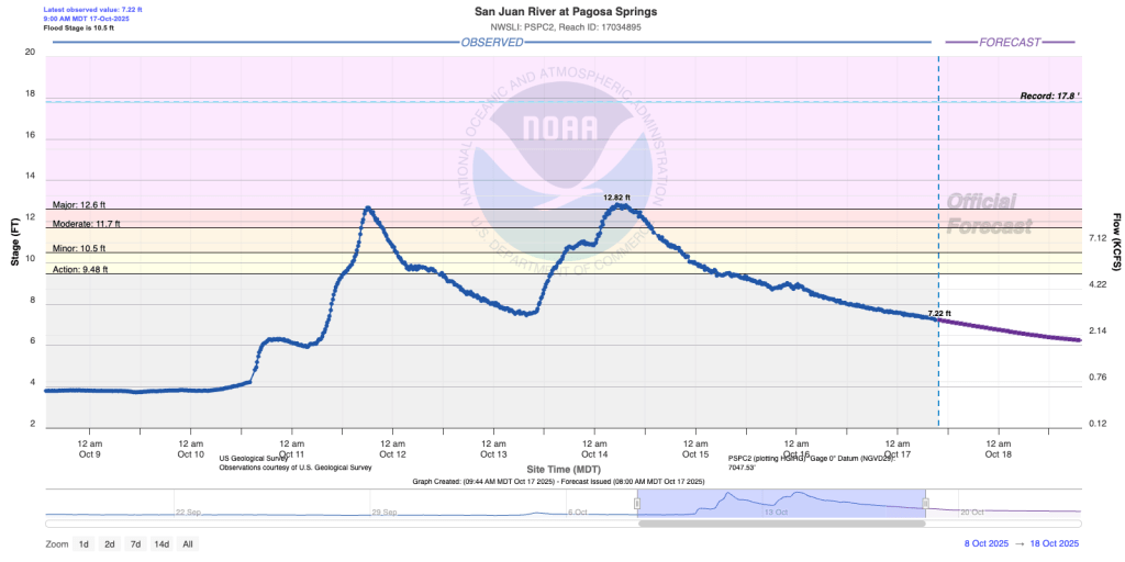 With soils already saturated and rivers and creeks running high, the Monday rainfall led to even more flooding in La Plata and Archuleta Counties. The San Juan River at Pagosa Springs actually peaked slightly higher on Tuesday morning than it did on Saturday, once again reaching major flood stage.