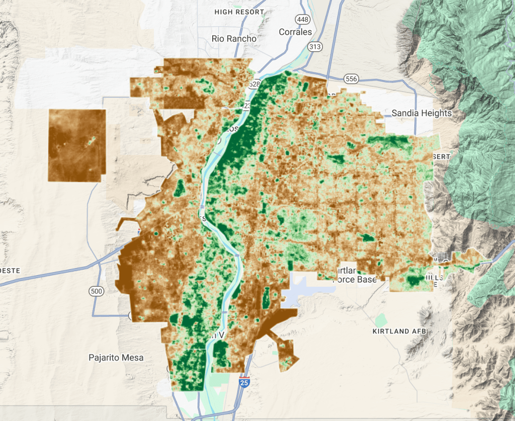 Density of domestic wells in greater Albuquerque. Dark green is >150 wells per square kilometer. Brown is no wells at all.