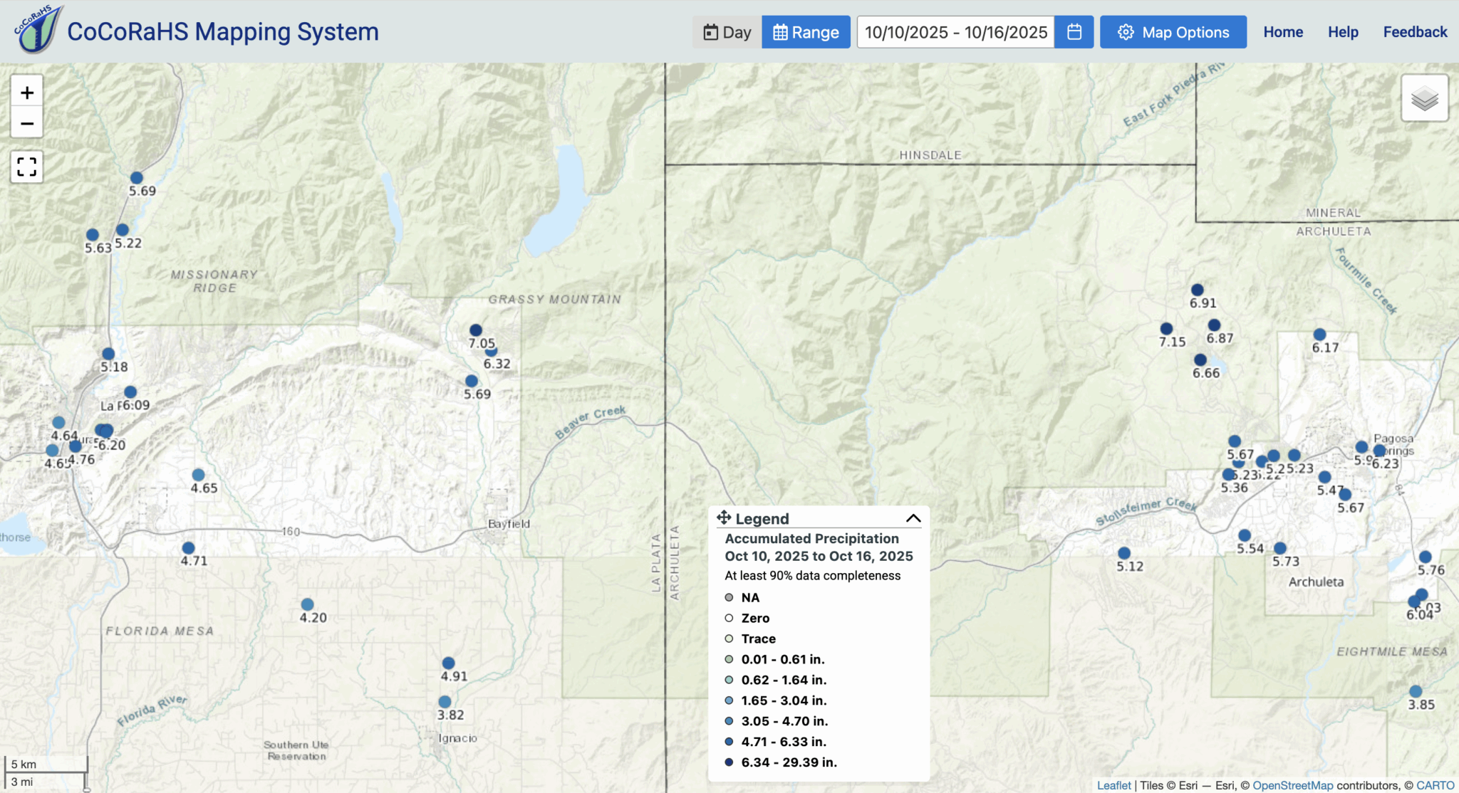 CoCoRaHS precipitation observations for the period from 10-16 October 2025 in La Plata and Archuleta Counties. From https://maps.cocorahs.org/