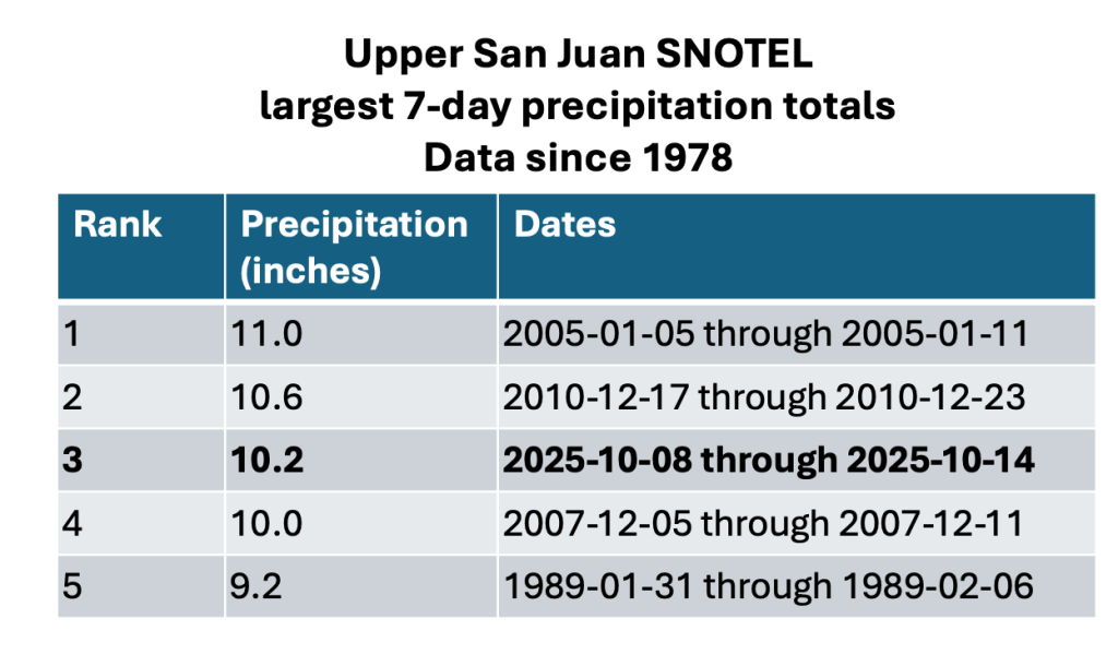 Updating the table from the previous post to show seven-day precipitation accumulations at the Upper San Juan SNOTEL station, we see that the 10.2″ from the recent storm is surrounded only by huge winter snowstorm cycles. In the years since that station was established in 1978, there aren’t any fall rainstorms that come anywhere close to rivaling it.