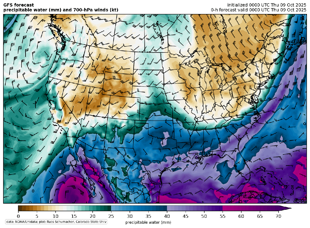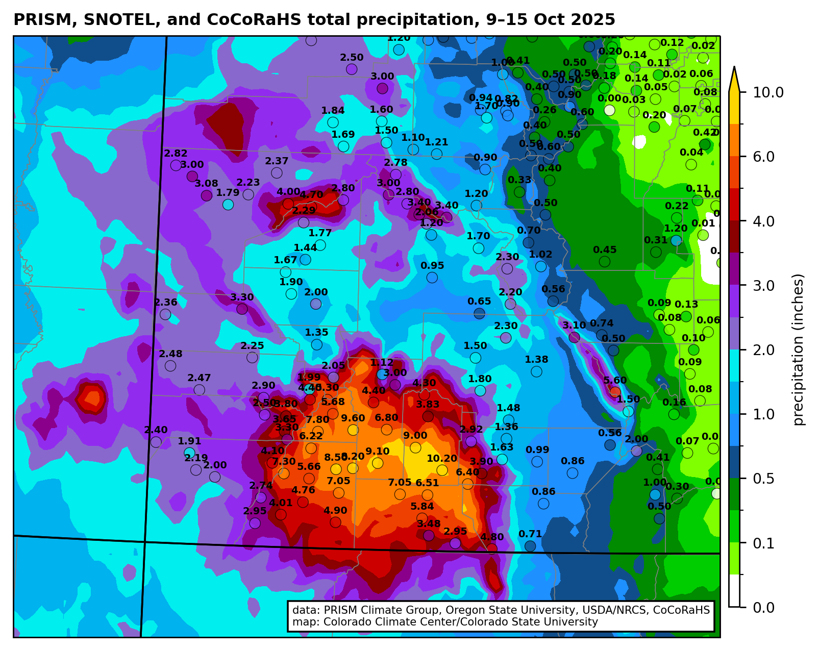 Total precipitation (inches) from 9-15 October 2025 with gridded data from the PRISM Climate Group and observations from the Community Collaborative Rain, Hail, and Snow (CoCoRaHS) network.