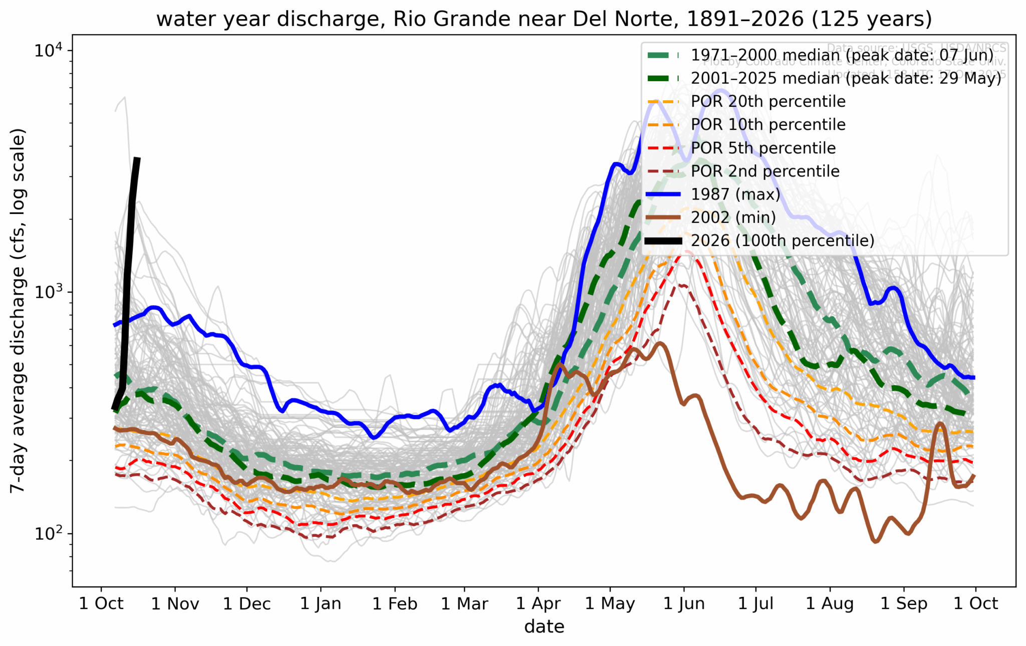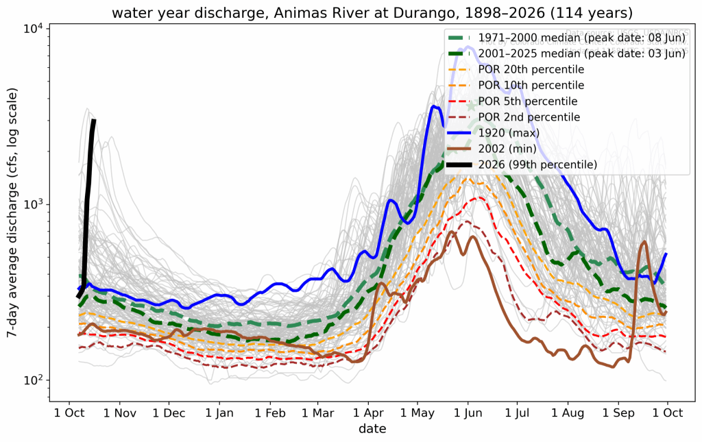 Both the Animas and Rio Grande Rivers saw huge increases in streamflow, with 7-day average flows near record levels for the fall, and close to the average early-summer peak from snowmelt runoff. On the Rio Grande, only the peak from October 1911 is higher than the current average flow for the period between October and April. [Daily data is missing for the Animas in October 1911, but it surely peaked even much higher than shown on the graph.]