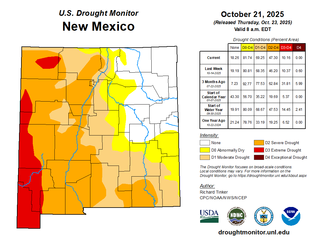 Drought is measured through multiple sectors: hydrological, referring to reservoir and river levels; agricultural, referring to how drought impacts crops; and ecological, referring to forest health. The U.S. Drought Monitor tracks the short-term drought across the state, categorizing it from “abnormally dry” to “exceptional” in intensity. A swath of northeastern New Mexico is not currently experiencing drought, but the rest of the state is facing at least abnormally dry conditions, according to the monitor’s most recent data; the drought is worst in southwestern New Mexico, as it has been for months…Around the time the reservoir storage levels dropped, the Southwest entered what scientists call a megadrought, now in its 25th year. This is believed to be the worst megadrought of the past 1,200 years, and recent research from the University of Texas at Austin indicates it could continue at least through the end of the century. New Mexico’s long-term drought wholly improving would require heavy wintertime snows in the northern part of the state and in southern Colorado, Mangham said, as that’s the source of much of the water that ends up “recharging” the state’s rivers and reservoirs…Snowpack is more helpful for drought than the spotty, hard-hitting storms of the summer monsoon, Mangham said. This is because snow is typically slower-moving than rain — and too much rain at once leaves only a little soaking into the soil.