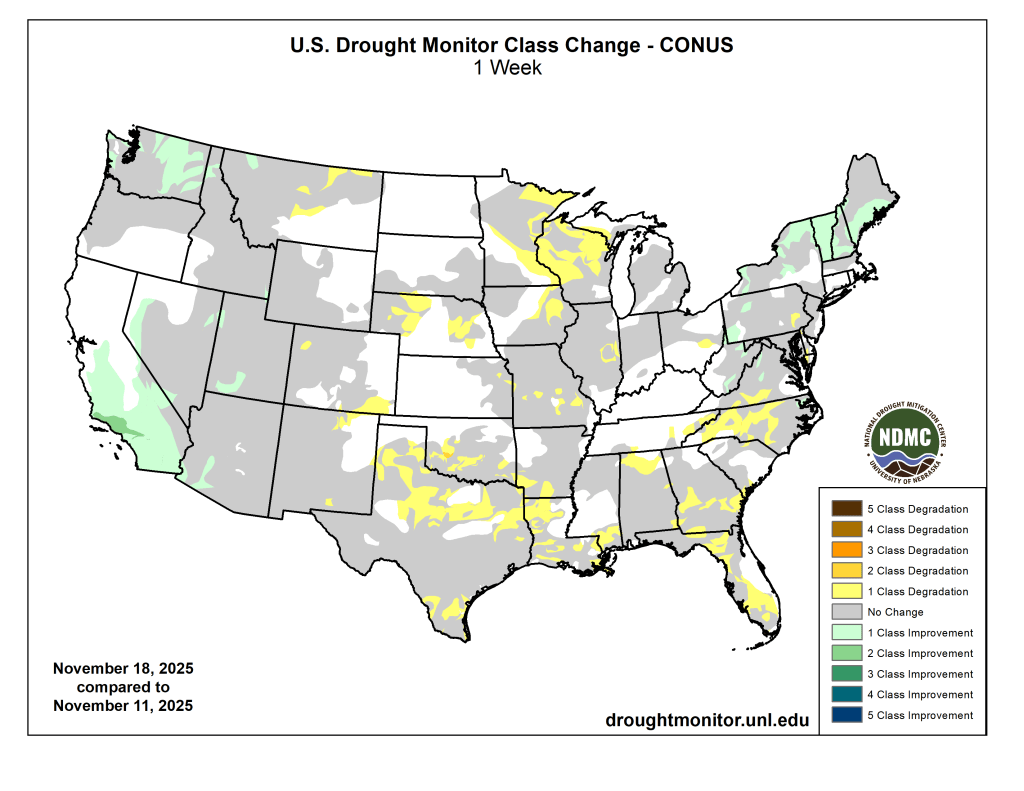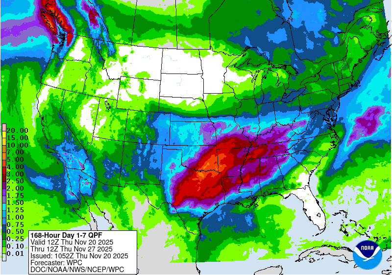 From the evening of Nov. 19 through Nov. 24, the National Weather Service Weather (NWS) Prediction Center is forecasting a large area to receive near or over 1 inch of precipitation from southern Ohio eastward to northeast Colorado and south to northwest Louisiana and much of Oklahoma and Texas (excluding the southwest). Precipitation amounts of at least 0.75 inches are also forecast in parts of southern California, southern Arizona and southeast two-thirds of New Mexico. Heavy precipitation, locally exceeding 3 inches, is forecast in parts of western Washington. Mostly dry weather is forecast across the northern Great Plains and from the Upper Midwest eastward to most of New York and northern New England. Dry weather is also likely to continue in much of the Southeast, especially in drought-stricken areas of southeast Louisiana, southern Georgia and Florida.