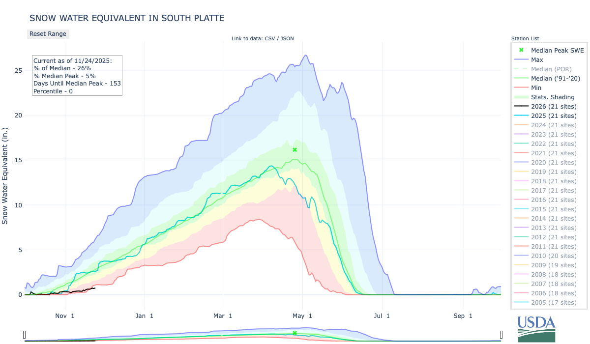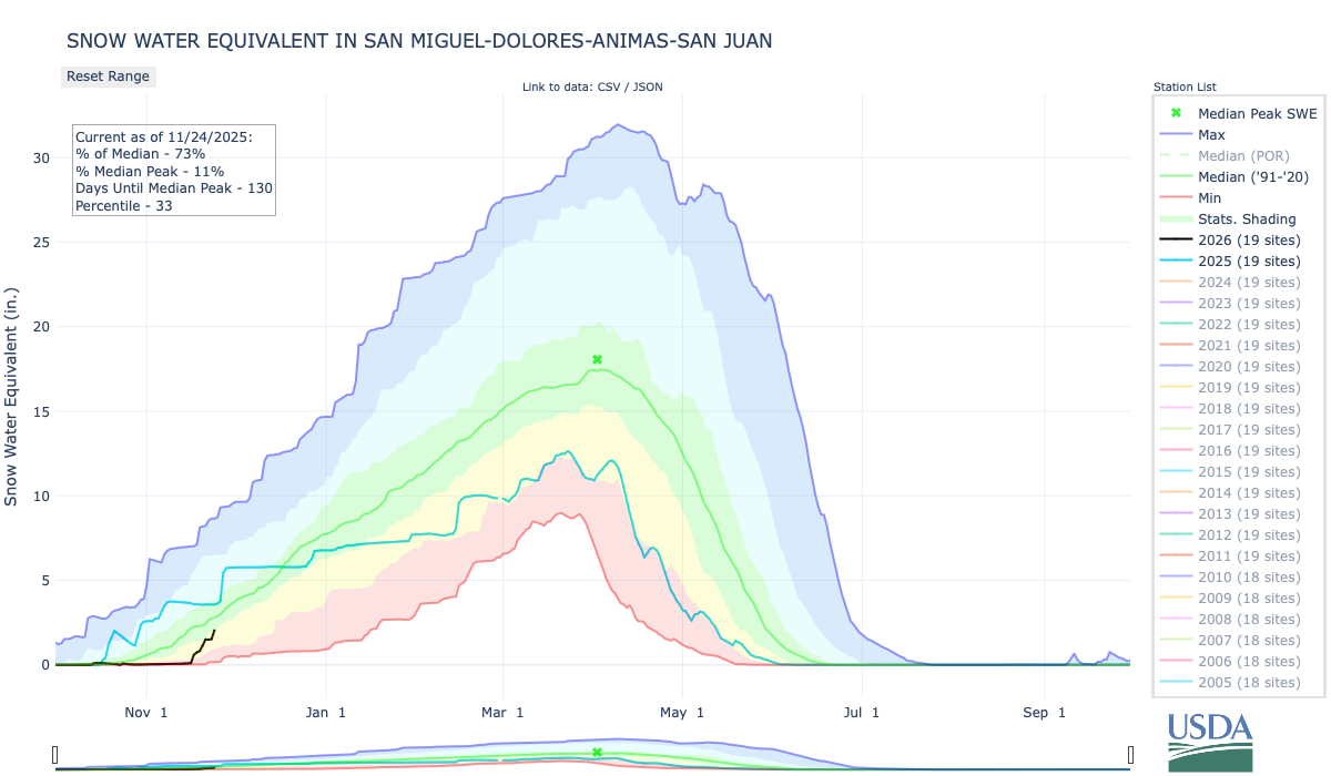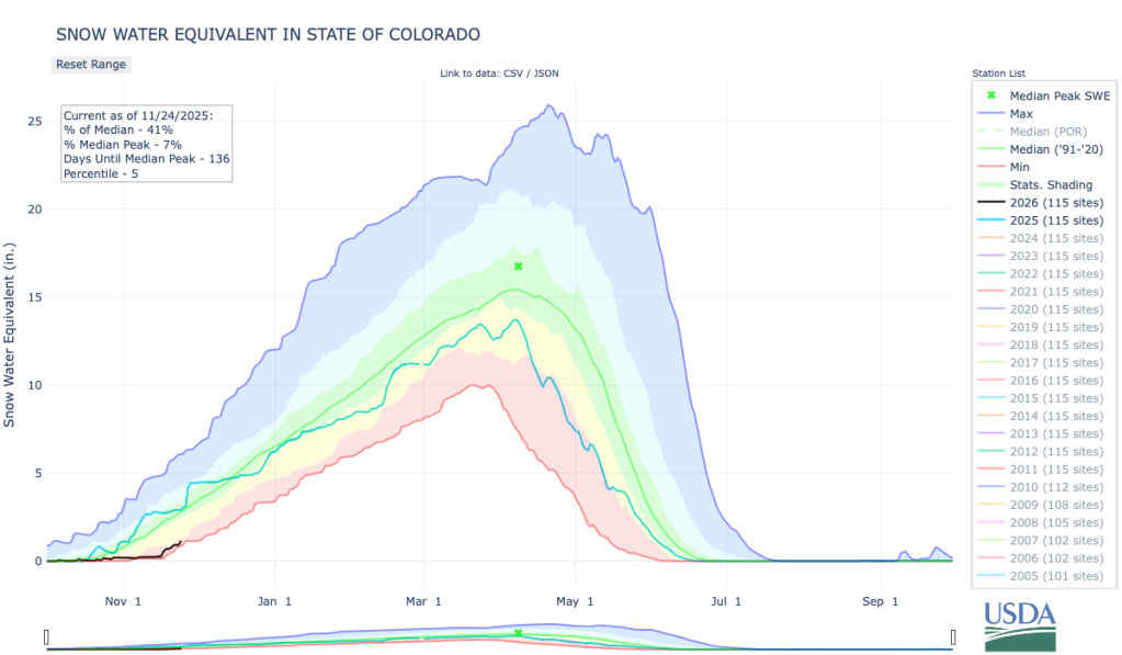 #Snowpack news November 24, 2025 Westwide SNOTEL basin-filled map November 23, 2025. Colorado SNOTEL basin-filled map November 23, 2025. Share this: Click to share on Bluesky (Opens in new window) Bluesky Click to share on LinkedIn (Opens in new window) LinkedIn Click to share on Facebook (Opens in new window) Facebook Click to email a link to a friend (Opens in new window) Email Click to print (Opens in new window) Print Click to share on X (Opens in new window) X Like this:Like Loading...