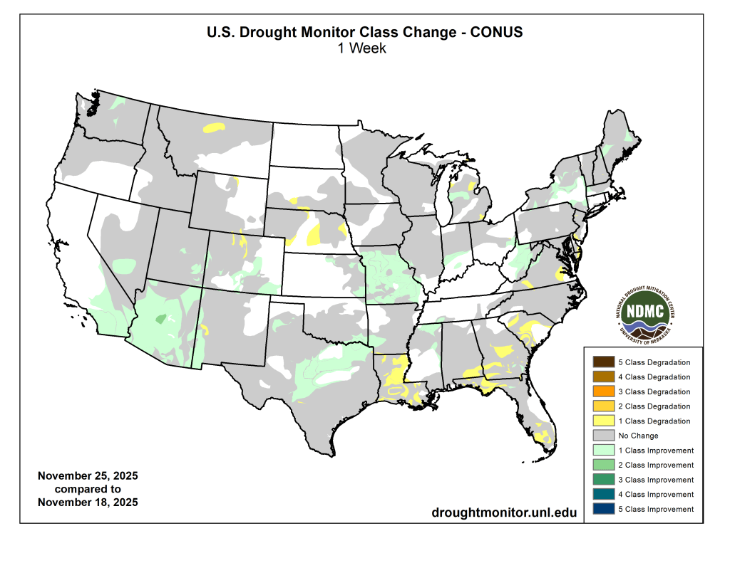 Across much of the region, generally dry conditions prevailed this week, especially in the far southern and western portions of the region, with little or no precipitation observed. In contrast, light to moderate rainfall (2 to 4+ inches) was observed along a swath extending from central Texas to southwestern Arkansas. The beneficial rainfall led to one-category improvements in areas of Moderate (D1) to Extreme Drought (D3) with most of the improvements focused on areas of central and northeastern Texas. Elsewhere, minor improvements were made on the map in southeastern Oklahoma, southwestern Arkansas, and northern Mississippi. In Louisiana, short-term precipitation deficits (past 90-day period) and declining soil moisture levels led to expansion of areas of Moderate Drought (D1) and Severe Drought (D2). For the week, average temperatures were well above normal across the region with anomalies ranging from 4 to 16 degrees F above normal. Looking at reservoir conditions in Texas, Water for Texas (November 25) was reporting statewide reservoirs at 74% full, with many reservoirs in the eastern part of the state in very good condition, while numerous reservoirs in the western portion of the state were experiencing continued below-normal levels…