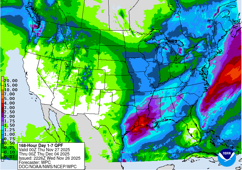 The NWS Weather Prediction Center 7-Day Quantitative Precipitation Forecast (QPF) calls for moderate precipitation accumulations ranging from 2 to 4+ inches (liquid) across areas of the South and areas of the Southeast. Likewise, a significant winter storm is expected to impact the Upper Midwest and Great Lakes regions. In the West, dry conditions are expected to prevail across California and the Great Basin, while some lighter accumulations are expected across the Intermountain West. In the Pacific Northwest, moderate accumulations are expected across western Washington and some lesser accumulations across areas of the Northern Rockies of Idaho and northwestern Montana. The Climate Prediction Center 6-to-10-day Outlook calls for a moderate-to-high probability of below-normal temperatures across the eastern half of the West, Plains, South, Midwest, and Northeast. Above-normal temperatures are expected across the Southeast and along the Pacific Coast from Northern California to Washington. In terms of precipitation, there is a low-to-moderate probability of above-normal precipitation across most of the conterminous U.S. except for northern California and western Oregon where below-normal precipitation is favored.