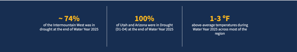 - Water Year 2025: Precipitation was lower than average in western portions of the region, and greater than average in eastern parts of Colorado, New Mexico, and Wyoming. Much of the Intermountain West experienced warmer-than-average temperatures.