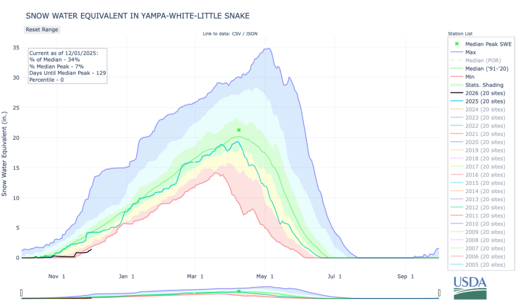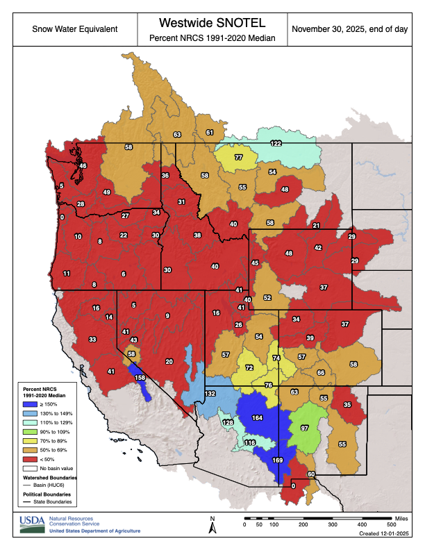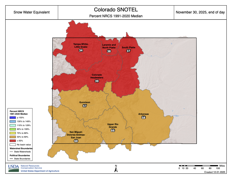 #Snowpack news December 2, 2025 Westwide SNOTEL basin-filled map November 30, 2025. Colorado snowpack basin-filled map November 30, 2025. Share this: Click to share on Bluesky (Opens in new window) Bluesky Click to share on LinkedIn (Opens in new window) LinkedIn Click to share on Facebook (Opens in new window) Facebook Click to email a link to a friend (Opens in new window) Email Click to print (Opens in new window) Print Click to share on X (Opens in new window) X Like this:Like Loading...