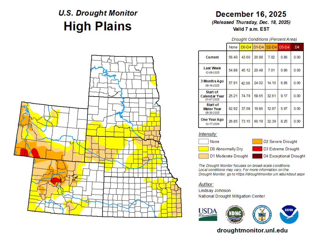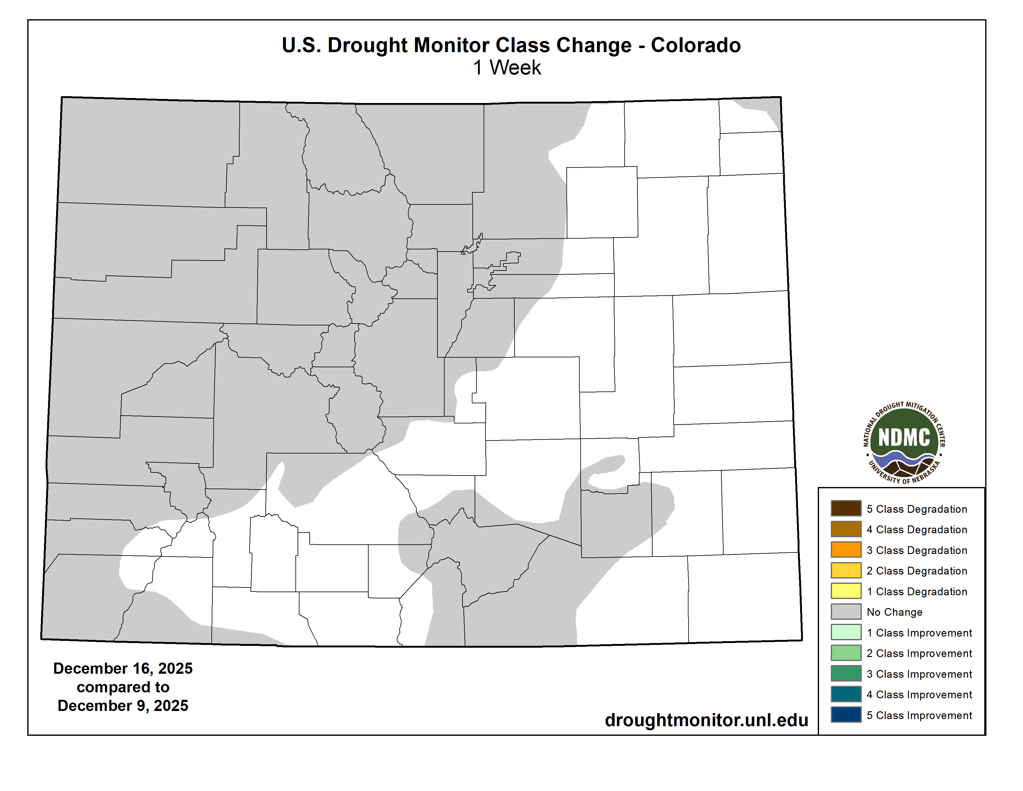 Across the central Rocky Mountains of Wyoming and Colorado, conditions were more mixed. Portions of the north-central Rockies received enough snowfall to lead to localized improvements, with SWE in some headwater areas approaching near-normal early-season levels. Elsewhere, c. Across much of western and central Utah, SWE remains below 50 percent of normal, supporting one-class degradations in north-central and central Utah. In the Southwest, localized changes were made in New Mexico, with improvements in central New Mexico where longer-term precipitation from earlier periods continued show hydrologic improvement, while precipitation deficits led to the expansion of moderate drought (D1) in the southeast part of the state…