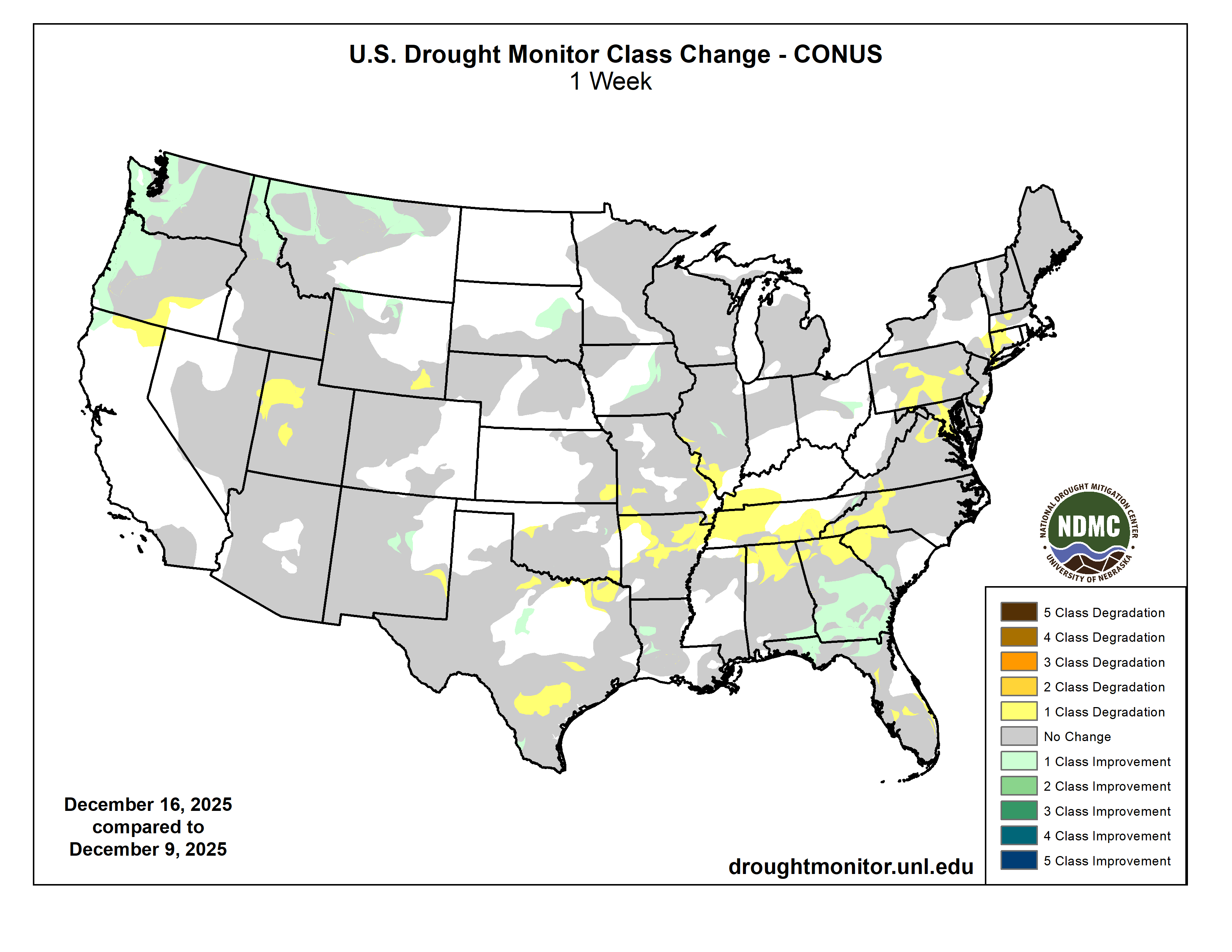 This week, temperature and precipitation patterns varied sharply across the country. Temperatures were generally warmer in the West and colder in the east, with much of the Cascades and Rocky Mountains running well above normal while the Midwest experienced much colder-than-normal conditions. Multiple Pacific storm systems brought widespread precipitation to the Pacific Northwest and northern Rockies, falling as rain at lower elevations and snow in the mountains; however, despite recent snowfall, snowpack remains below normal for mid-December. East of the Rockies, precipitation was more limited and uneven, and where it did occur across the northern Plains and Midwest, it often fell as snow. As a result, drought conditions improved mainly across parts of the Pacific Northwest and northern Rockies. Additional localized improvements occurred in parts of the Southeast, where lingering benefits from rainfall in prior weeks continued to support soil moisture and streamflows. In contrast, areas farther south and east that missed meaningful precipitation saw conditions persist or worsen. Across portions of the southern Plains, lower Mississippi Valley, Ohio Valley, Mid-Atlantic, and Northeast, continued precipitation deficits and declining streamflows led to degradations. In the Midwest, colder temperatures limited precipitation to fall as snow, slowing hydrologic response and resulting in mostly localized changes…