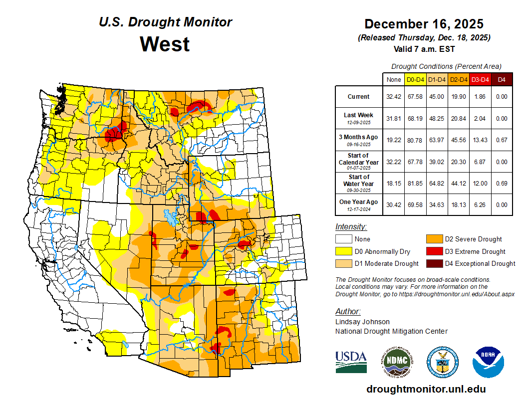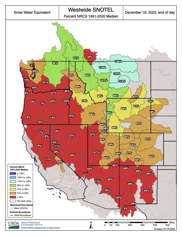 Across the West, drought changes were mainly determined by precipitation. In Washington and northern Oregon, multiple Pacific storm systems, associated with atmospheric river moisture, brought widespread precipitation to the Pacific Northwest. Precipitation fell mainly as rain at lower elevations and snow in the mountains, contributing to ongoing flooding in parts of western Washington and supporting widespread one-class improvements along the coast and nearby interior areas. Since the end of November, snowpack in the Cascades has slightly improved, though snow water equivalent (SWE) values remain below normal for this time of year, particularly where warmer temperatures limited snow accumulation. Across central and southern Oregon and into northern California, conditions show rapid short-term drying. [I spoke with Jeff Deem (Airborne Snow Observatories Inc.) at the Colorado River Water Users Association conference last week and he said that he flew over Lake Tahoe recently and there was NO SNOW.] However, last-minute (Dec. 15-16) rainfall of 1 to 2 inches along Oregon’s coast was enough to bring improvements where it fell while the areas that missed out on the precipitation saw abnormal dryness (D0) expanded.
