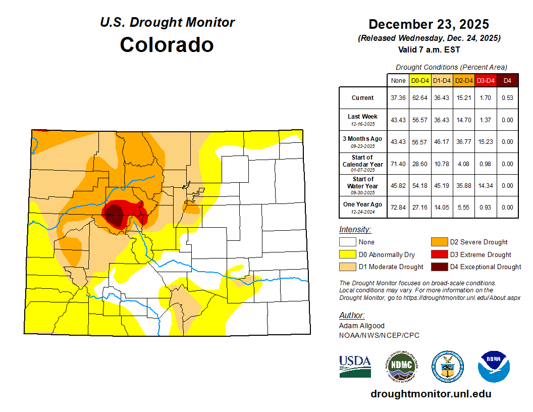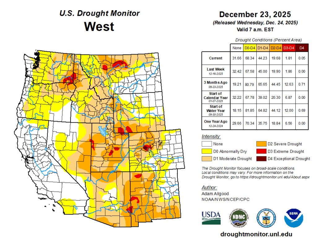 A lack of snow cover, much above-normal temperatures, and periods of strong winds led to an unusual amount of winter degradation across the High Plains region.D2 expanded across western Nebraska, with expansions of both D1 and D0 occurring across central and eastern parts of the state, where precipitation was generally less than 0.2 inch equivalent, and high temperatures soared as high as the 70s. A small area of D1 expanded across southeastern Kansas, and across Colorado, D4 was introduced to Eagle and Pitkin Counties. D0 expanded across the Plains of Wyoming, where warm temperatures, strong winds, and a record lack of snow cover promoted worsening impacts. Drought depictions remained unchanged across the Dakotas, where soils and streams have largely frozen for the winter…