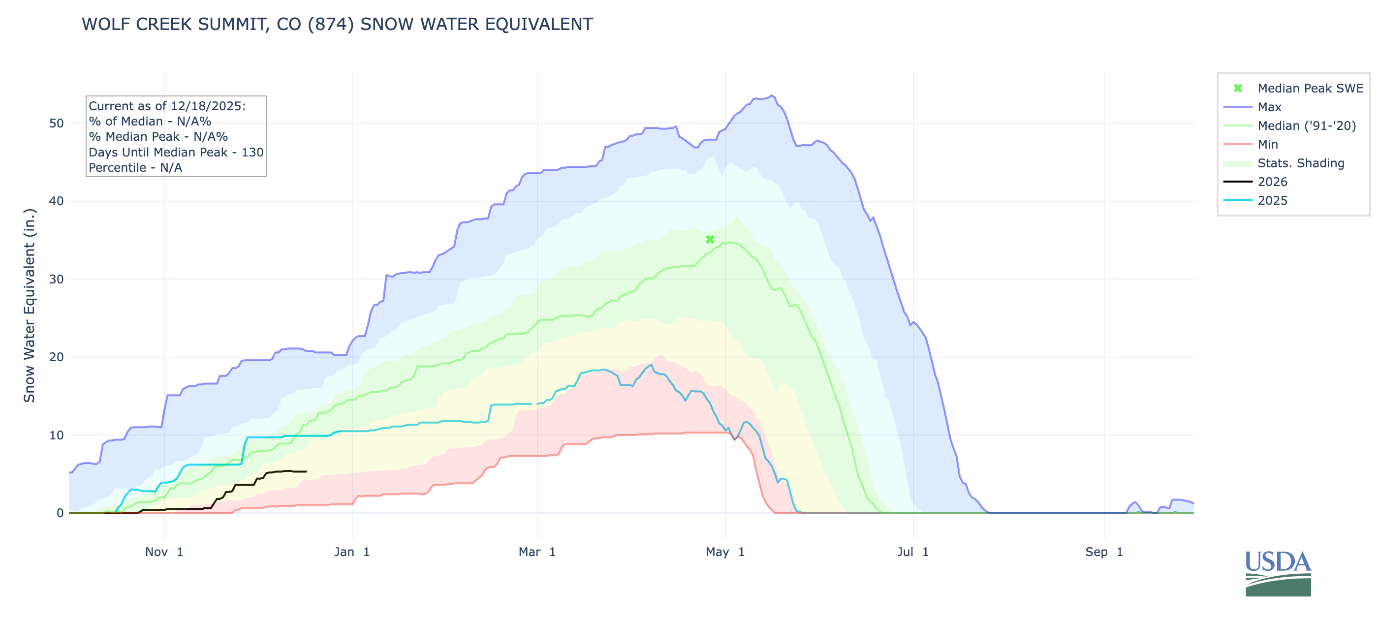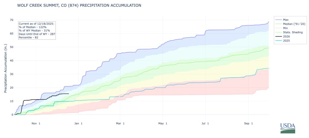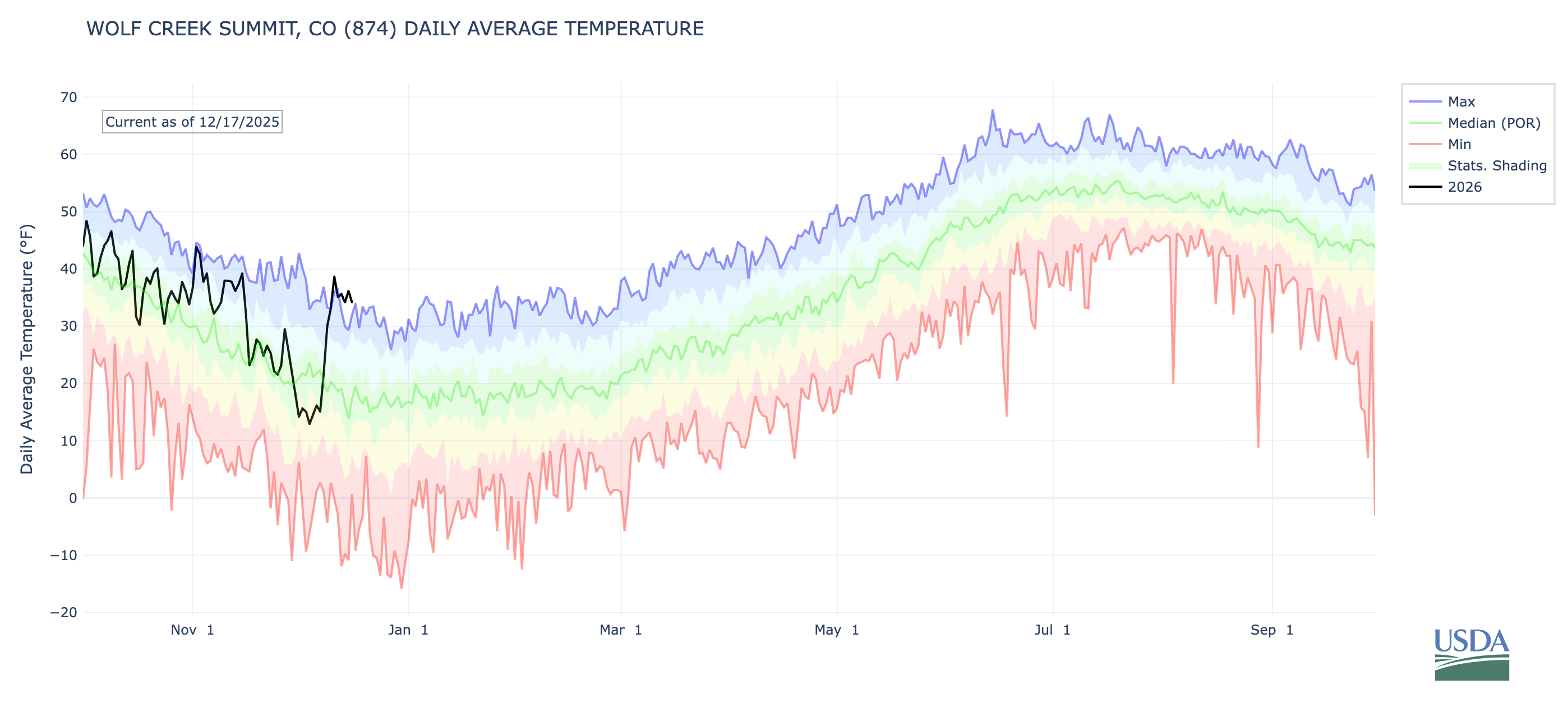 Most ski areas in the Interior West are open now, but that doesnāt mean the conditions are good.Ā To the contrary, theyāre generally lousy almost everywhere, with snowpack levels hovering around 50% ofĀ ānormalāĀ everywhere from Utahās Wasatch Range to Vail to Wolf Creek in southwestern Colorado. In most of those places the story of the season is the same: It started off with heavy rainfall, followed by a succession of decent snow storms that offered false hope, only to be dashed by a run of warm snow-melting temperatures.Ā So far the storyās even more extreme in the Sierra Nevada, where the mountains are utterly devoid of snow, despite massive, flood-inducing rains this fall. The following graphics from the Wolf Creek Pass SNOTEL station tell the story of most of the region: