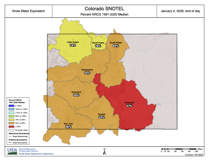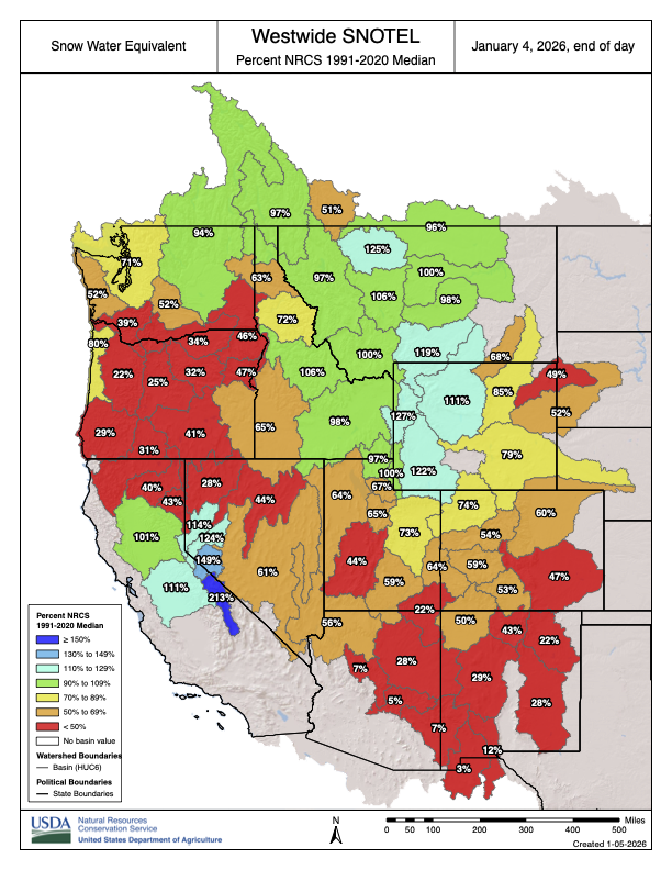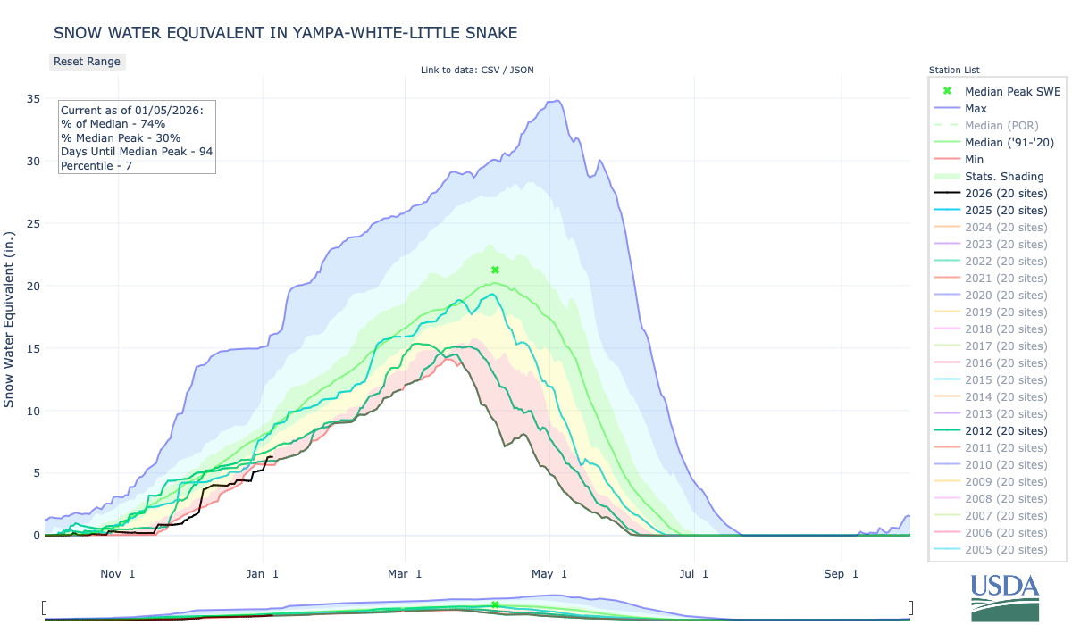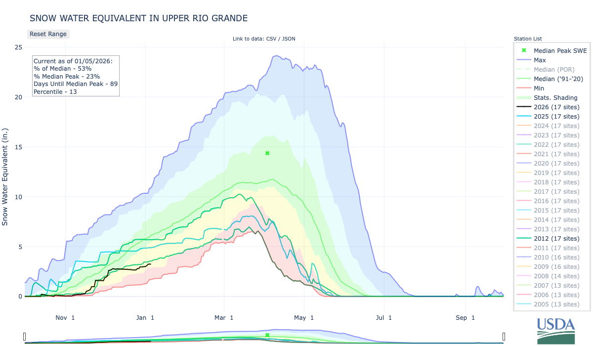 I’ve added the lines for 2025, 2012, and 2002 to the snow water equivalent graphs below (for Colorado). 2002 doesn’t show up in the legend but it is the line that generally follows the minimum on record.
