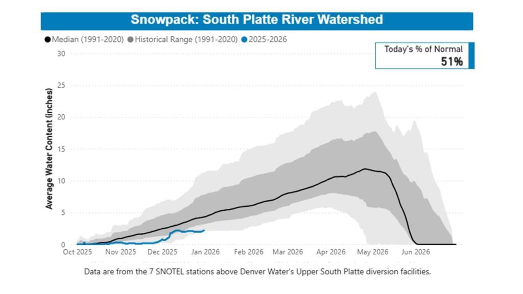 This year, as of Dec. 31, 2025, the snowpack in the South Platte and Colorado river basins where Denver Water collects water stood at 51% and 49% of normal, respectively, according to SNOTEL measurements.