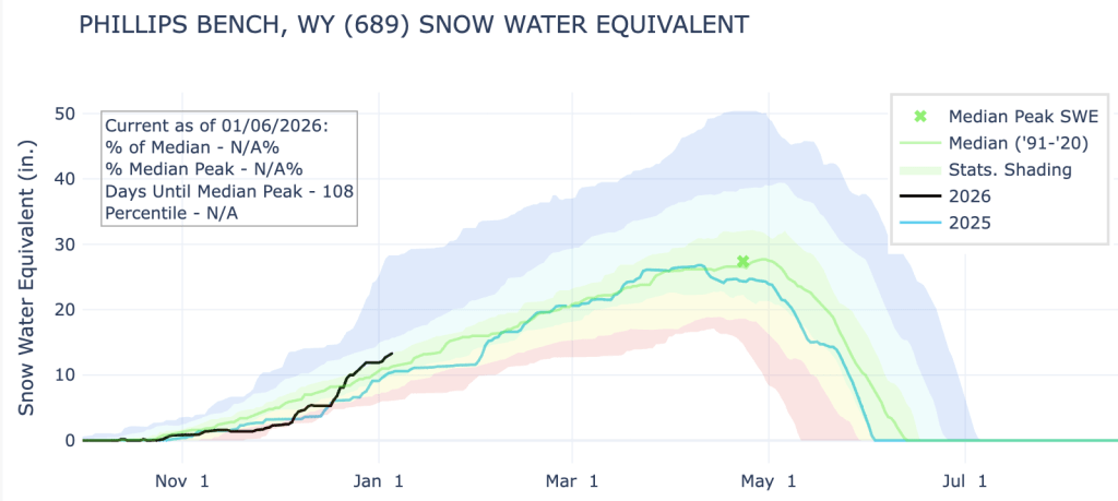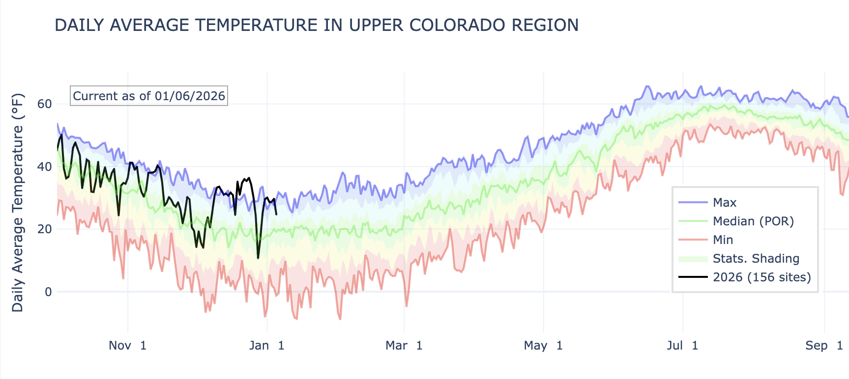 The San Juan Mountain snowpack levels are currently at about 50% of normal for the first week of January, and they are tied for third lowest snowpack level on record for this date. That’s not “too bad,” it’s downright dismal. And snow cover is even more meagre in other parts of the state: The Colorado River’s headwaters SNOTEL station is experiencing the lowest snowpack since it started recording in 1986.