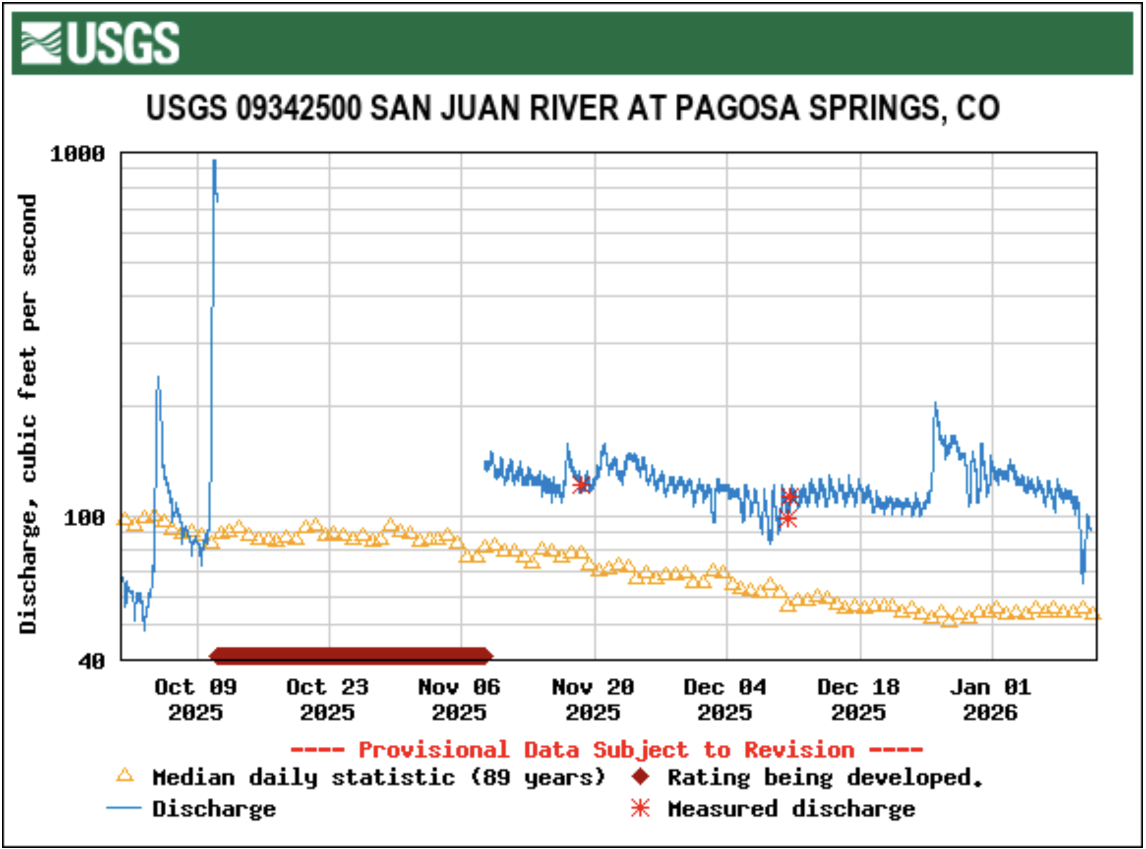 In Pagosa Springs, U.S. Geological Survey for the San Juan River at Pagosa Springs has showed record flows multiple times since the start of the year. For example, at 9 a.m. on Jan. 2, the river was running at 128 cubic feet per second (cfs), which compares to a median of 53 cfs and a previous high of 118 in 1986. At 11 a.m. on Jan. 5, the river was running at 119 cfs, which compares to a median for that date of 54.5 cfs and a previous max value of 116 in 1987. By 11 a.m. on Wednesday, Jan. 7, the river was flowing at 111 cfs. The Jan. 7 median is 55, and the record high is 116 cfs, which was recorded in 1987. According to the U.S. Drought Monitor’s most recent map released on Dec. 31, 2025, 100 percent of Archuleta County is in an “abnormally dry” drought stage.