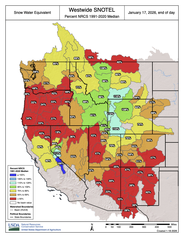 Colorado’s snowpack levels remain meager so far this winter season, with little moisture in the near-term local forecast in a year when water managers can scarcely afford a poor spring runoff season due to low storage levels downstream in Lake Powell. The state’s snowpack stood at 63% of median as of Tuesday, according to the federal Natural Resources Conservation Service. Levels range from 76-77% in some basins in far-northern Colorado to 58% in the Colorado River headwaters and just 50% in the Arkansas River basin. The Gunnison River Basin is at 63% of median.
