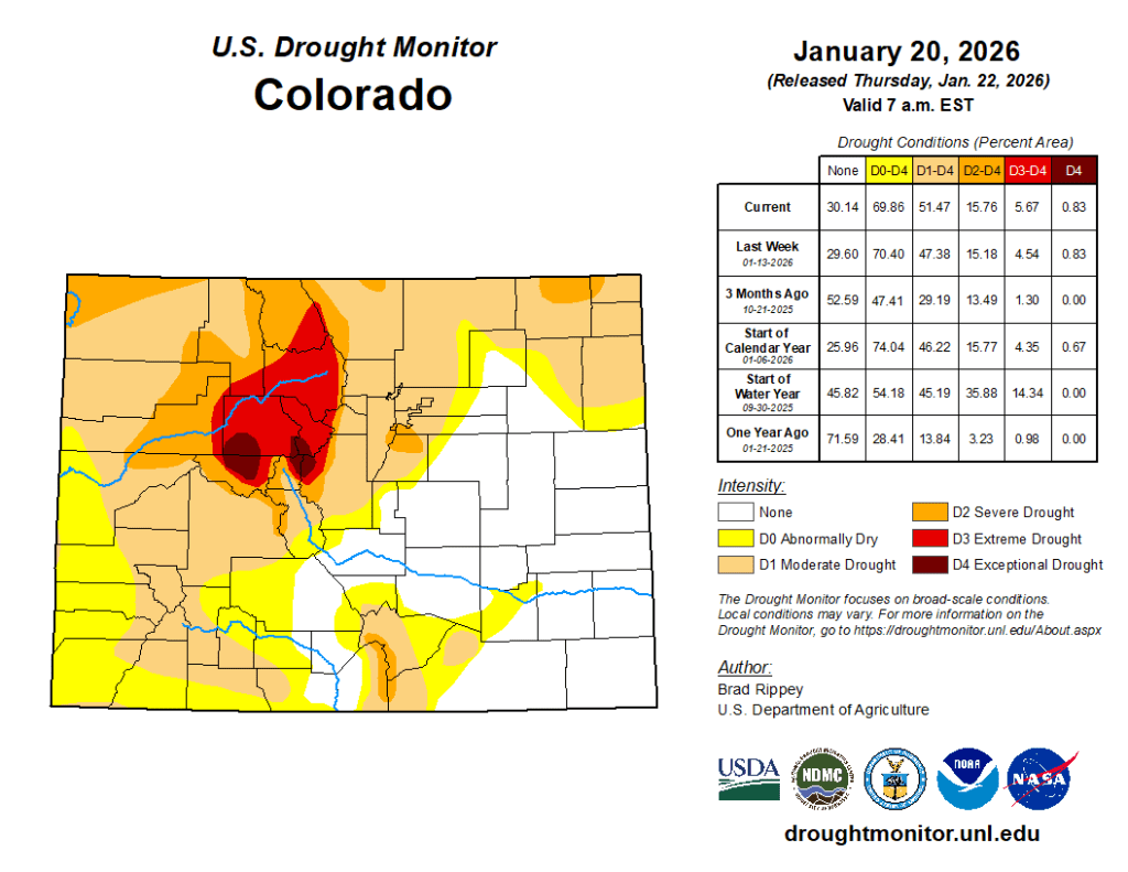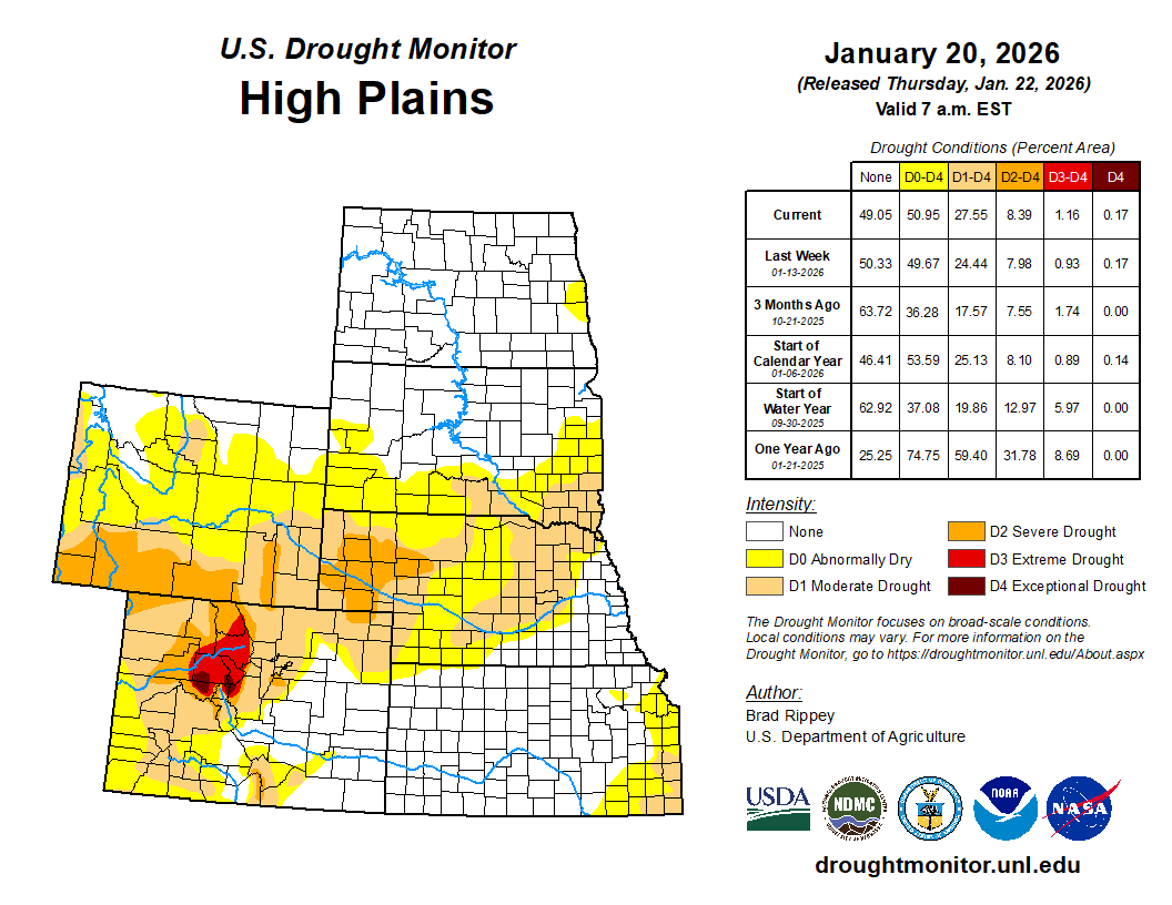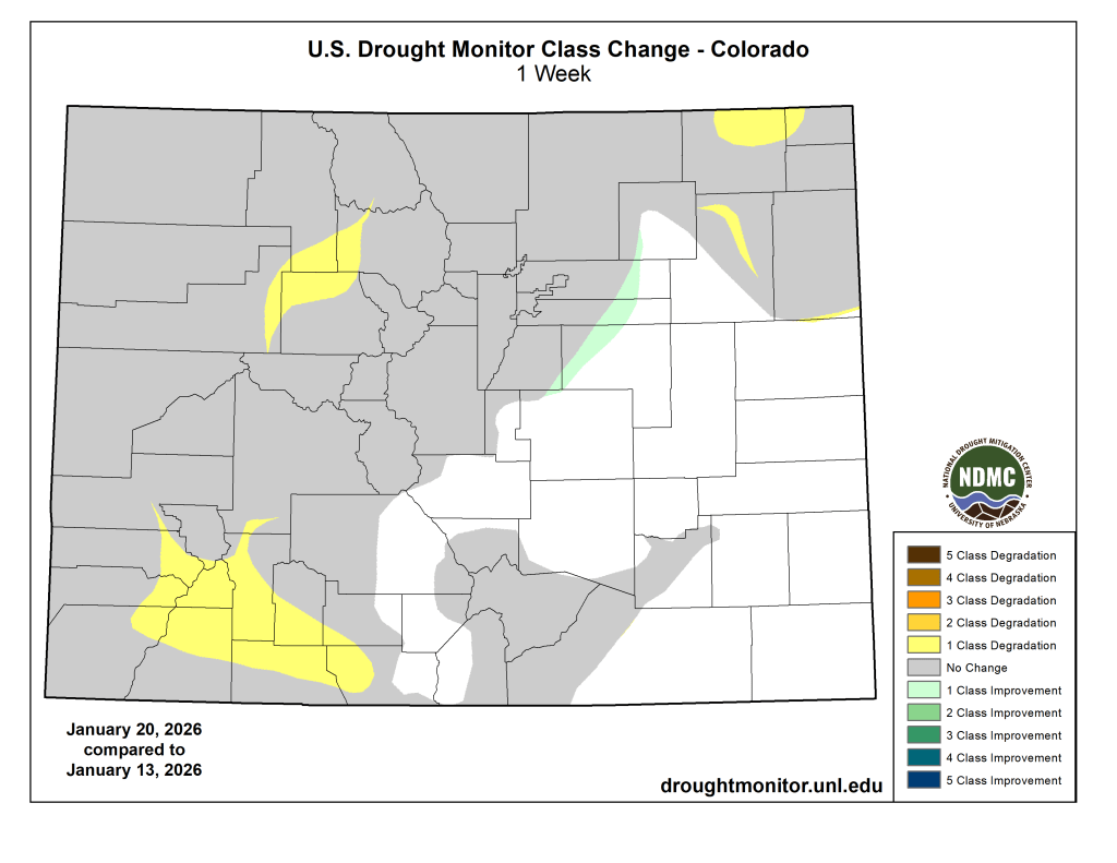 The Lower 48 States finally settled into a more tranquil weather pattern, as a ridge of high pressure settled across the West and a deep trough developed over the East. With many parts of the western U.S. reporting below-average snowpack for this time of year, the pattern change led to increasing concerns regarding Western water supply for next summer and beyond, despite robust precipitation in many areas during the first half of the winter wet season. Still, hydrologic signals were mixed, with California’s 154 primary intrastate reservoirs containing 25.9 million acre-feet of water (123% of the historic average) as 2026 began. Meanwhile, storage in the sprawling, multi-state Colorado River Basin stood at just under 17.3 million acre-feet (53% of average), reflecting long-term issues in part related to chronically elevated temperatures and a multi-decadal Southwestern drought. Farther east, the Plains served as the transition zone between mild, dry weather in the West and increasingly cold conditions in the East. The Plains’ experienced dry weather, aside from wind-driven snow showers on the northern Plains, as well as an occasionally elevated wildfire threat. Elsewhere, areas from the Mississippi Valley eastward noted cold weather, accompanied by occasional rain and snow showers. Some of the heaviest snow fell the Great Lakes States, especially in squall-prone locations. Snow also fell along and near the Atlantic Seaboard, mainly on January 17-18. As colder air became more entrenched in the Midwest and East, drought changes that had been occurring quickly in recent weeks, either due to flash drought or active winter storms, became more muted, with drought effectively “frozen in place” by chilly, mostly dry conditions. During the second half of the drought-monitoring period, sub-0°F temperatures were commonly observed across the upper Midwest and neighboring regions…