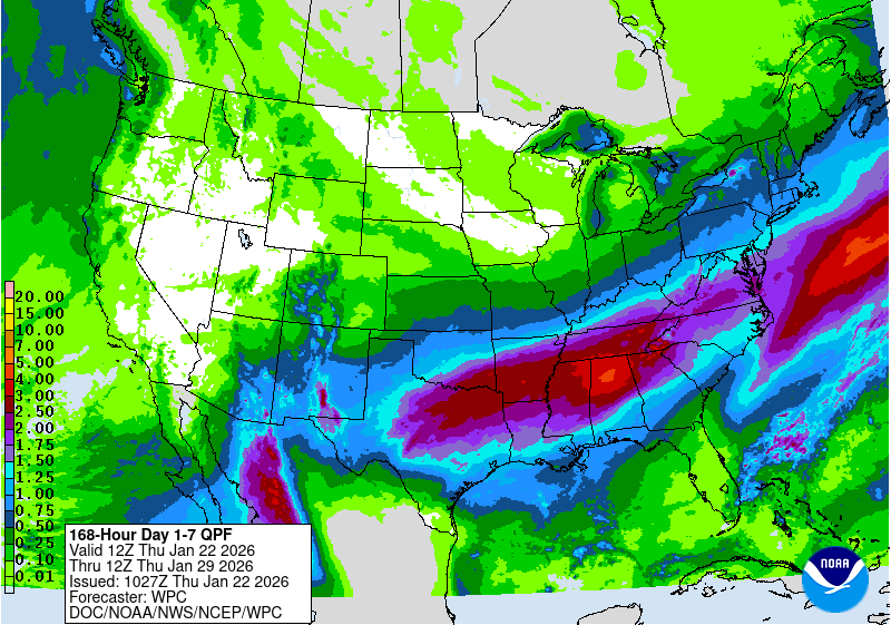 From January 23-26, an expansive and potentially dangerous winter storm will unfold from southern sections of the Rockies and Plains to the middle and southern Atlantic States, excluding areas along and near the Gulf Coast. Much of the South will face multiple weather hazards, including wintry precipitation (snow, sleet, or freezing rain), gusty winds, and unusually low temperatures. Wintry weather may extend at least as far south as central Texas and northern sections of Louisiana, Mississippi, Alabama, and Georgia. Post-storm temperatures should fall to 10°F or below along and north of a line from central Texas to northern Georgia, with particular concern for areas that lose electricity due to downed power lines from accumulations of ice and snow. Farther north, sub-0°F readings will be common as far south as the central Plains and the Ohio Valley. The storm is likely to have serious agricultural impacts, including significant stress on livestock due to exposure to cold, wind, wintry precipitation, or a combination of weather extremes. Temperatures could briefly plunge to -30°F or below from North Dakota into the upper Great Lakes region.
