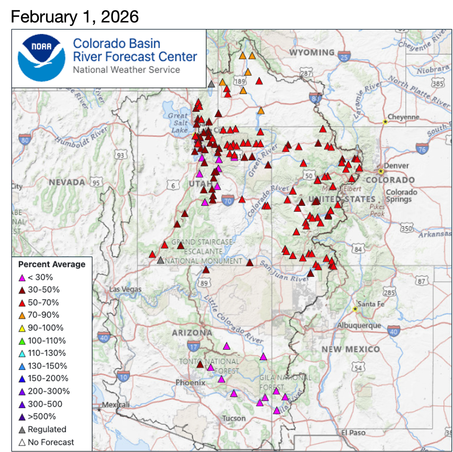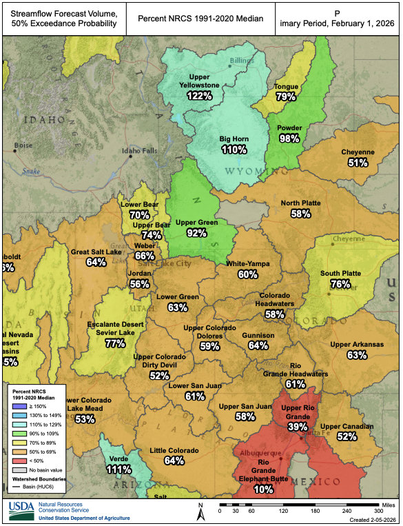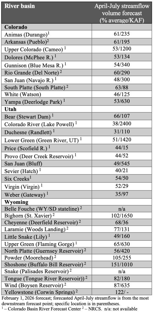 Continued drought conditions plagued much of the region during January. After significant regional precipitation during the first week and a half of January, dry conditions dominated, and little precipitation fell during the remainder of the month. Consequently, regional snowpack and streamflow volume forecasts are extremely low. Record low statewide snowpack conditions exist in Colorado and Utah while Wyoming statewide SWE is 84% of average, driven by wetter conditions in western and northern Wyoming. While northern Wyoming streamflows are near to above average, much below average streamflow volumes are forecasted for the remainder of the region including Lake Powell which is forecasted to receive 38% of average inflow. With Lakes Mead and Powell storage hovering just above 25%, forecasts of low Colorado River flows, and continued Post-2026 Guidelines negotiations, 2026 is certain to be a challenging year for regional water managers.