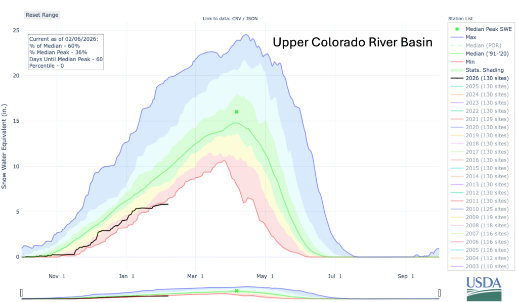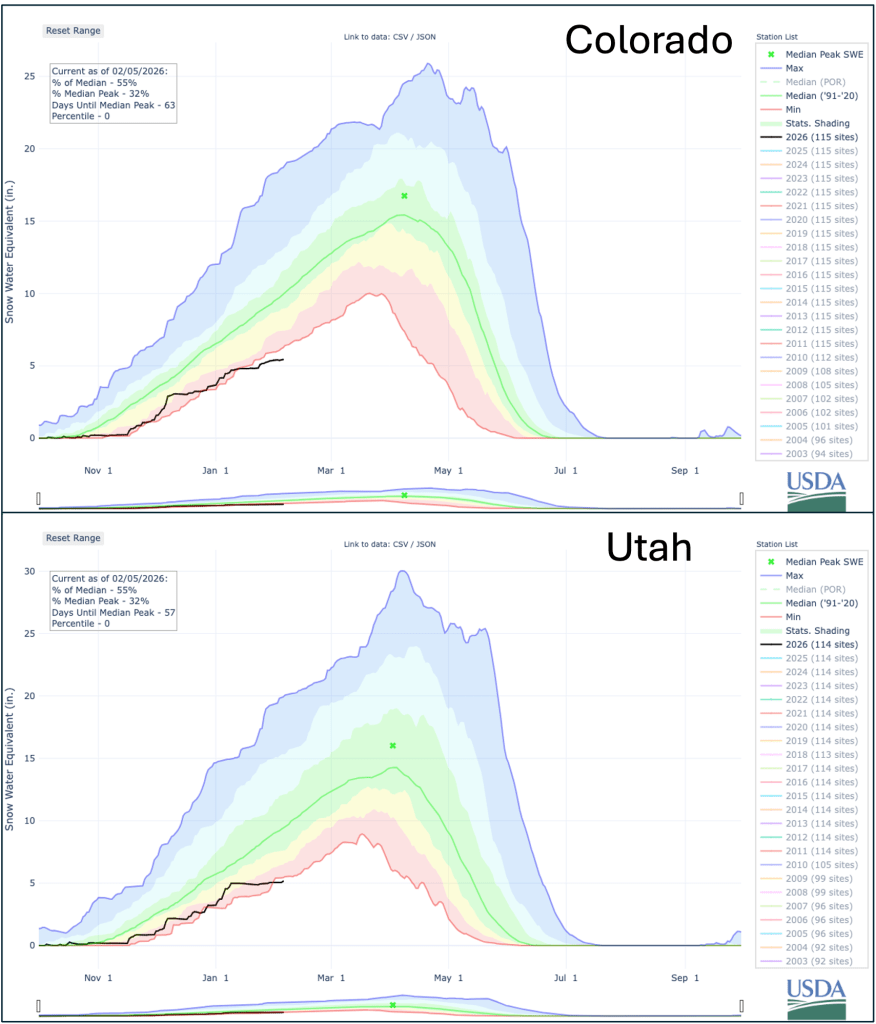 Significant weather event: Upper Colorado River Basin drought. The Upper Colorado River Basin (UCRB) began the 2026 water year with severe or extreme drought conditions covering nearly the entire watershed. Drought conditions have eased slightly, largely due to a wet October, but basin SWE is currently at 60% of median which is a record low (since 1986). If an average amount of SWE accumulates in the UCRB from February 10 to early April, then the 2026 peak SWE would remain low at 77% of average. Poor snow conditions and relatively dry soils throughout much of the UCRB have resulted in very low (38% of average) Colorado River inflow forecasts to Lake Powell. With a current Lake Powell elevation of 3,535 feet and poor Colorado River streamflow volume forecasts, low reservoir elevations will threaten Glen Canyon Dam’s ability to generate electricity by the end of 2026. The US Bureau of Reclamation’s 24-Month Study projects Lake Powell elevations two years into the future. Under the “Most Probable” scenario, Lake Powell elevation falls to 3,513 feet, just 23 feet above the elevation that the hydroelectricity-generating turbines must be shut down. Under the “Minimum Probable” scenario, reservoir elevations fall to 3,490.6 feet, just inches above the level that power generation at Glen Canyon Dam must cease. Operating Glen Canyon Dam is possible below 3,490 feet, but electrical generation must be bypassed and the alternate outlet for the dam was not engineered to run continuously. With Lakes Mead and Powell sitting at one-third and one-quarter full, only 15 million acre-feet (MAF) of combined water storage exists. However, only 6.3 MAF is available for consumption since nearly 9 MAF of water sits below the deadpool elevation of the reservoirs (Colorado River Research Group, “Dancing with Deadpool“). That means that current accessible storage in the two large reservoirs is less than one year of Lower Basin water deliveries from Lake Powell (7.5 MAF). While the UCRB has faced significant drought challenges over the last 25 years, current and forecasted conditions are taking the basin into truly unprecedented waters.