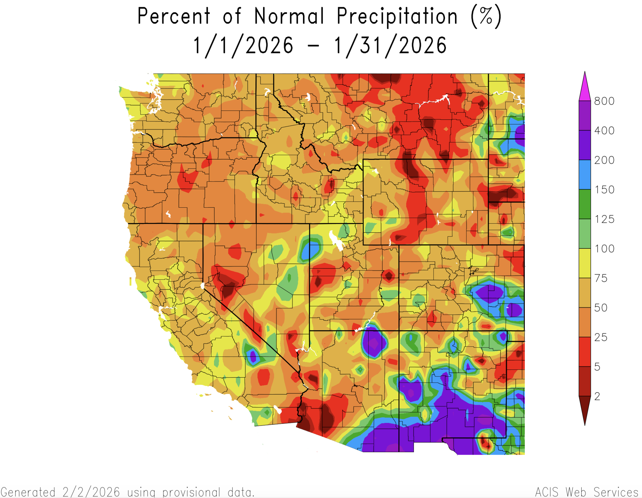 January precipitation was much below normal for the majority of Colorado, Utah and Wyoming and over three-quarters of the region received less the 75% of average precipitation. Small areas of near average precipitation fell in all three states and eastern Colorado received 125-400% of average January precipitation.