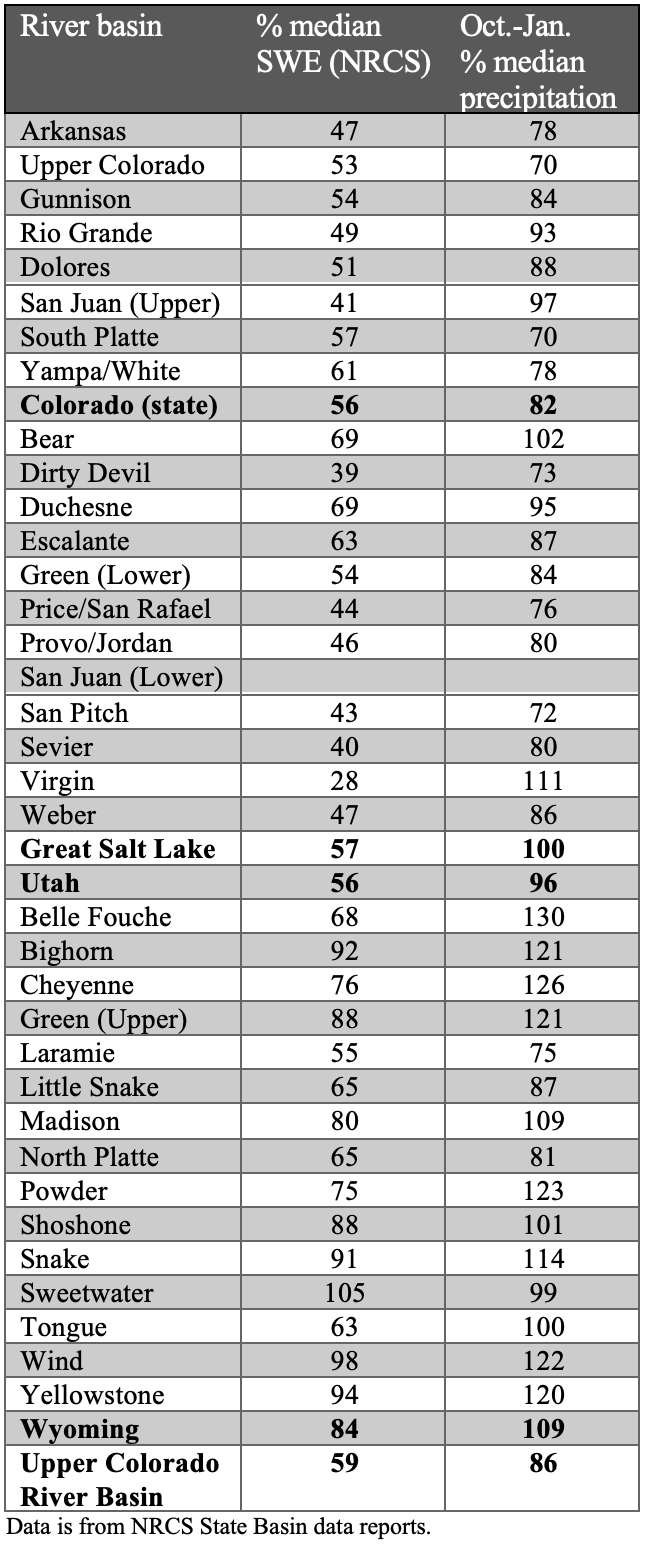 February 1st snowpack conditions were poor across most of the region. Colorado and Utah snow water equivalent (SWE) was 55% of median at the start of February and at record low levels. Snowpack conditions in Wyoming are slightly better with 84% median SWE statewide. Western Wyoming river basins (Bighorn, Green, Snake, and Yellowstone) had near median SWE. Regional snowpack conditions generally deteriorate from north to south with the worst snowpack conditions in the Arkansas, Rio Grande, and San Juan River basins where less than 50% median SWE has accumulated. Real-time estimates of SWE based on satellite imagery suggest significantly poorer snowpack conditions compared to SNOTEL measurements of SWE. These spatial estimates of SWE often differ from SNOTEL SWE measurements because they capture SWE across the entire elevation range while SNOTEL measures SWE across a narrower elevation range. In Utah, February 1 river basin percent SWE varied from 12-54% of average; in Colorado, basin percent SWE ranged from 19-54%; and in Wyoming, basin SWE ranged from 4-110%.
