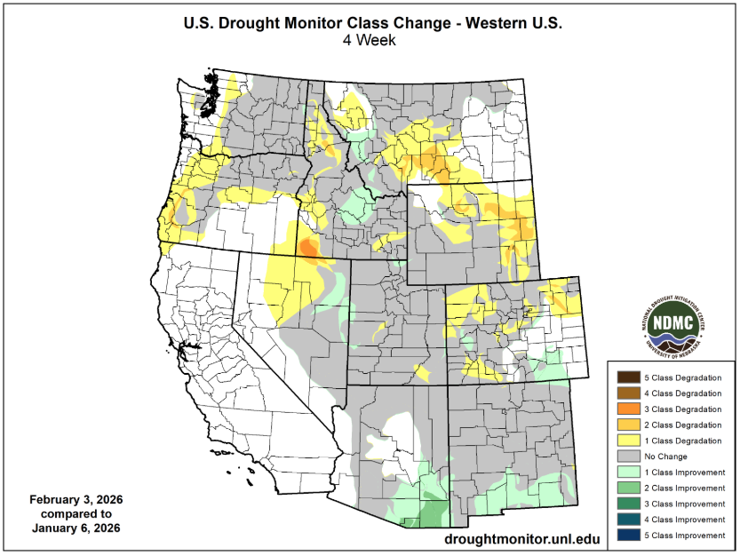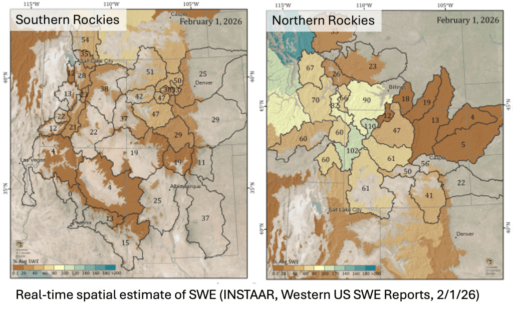 Dry and warm conditions during January caused regional drought coverage to increase to 63% (54% of region on 12/30/25). Drought conditions especially deteriorated in Colorado, where moderate drought emerged in northeastern and southwestern Colorado and severe drought expanded in western Colorado. The area of extreme and exceptional drought in the Colorado River headwaters increased in area during January. Drought emerged in eastern Wyoming and severe drought expanded in the southern portion of the state.