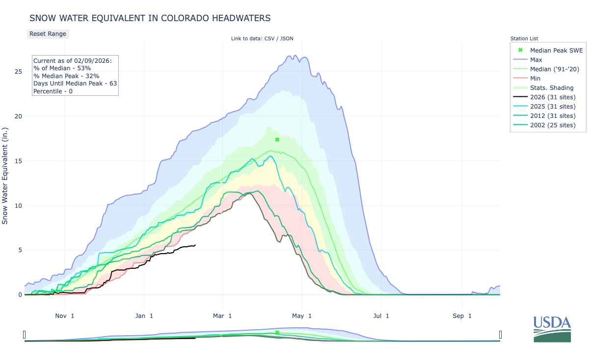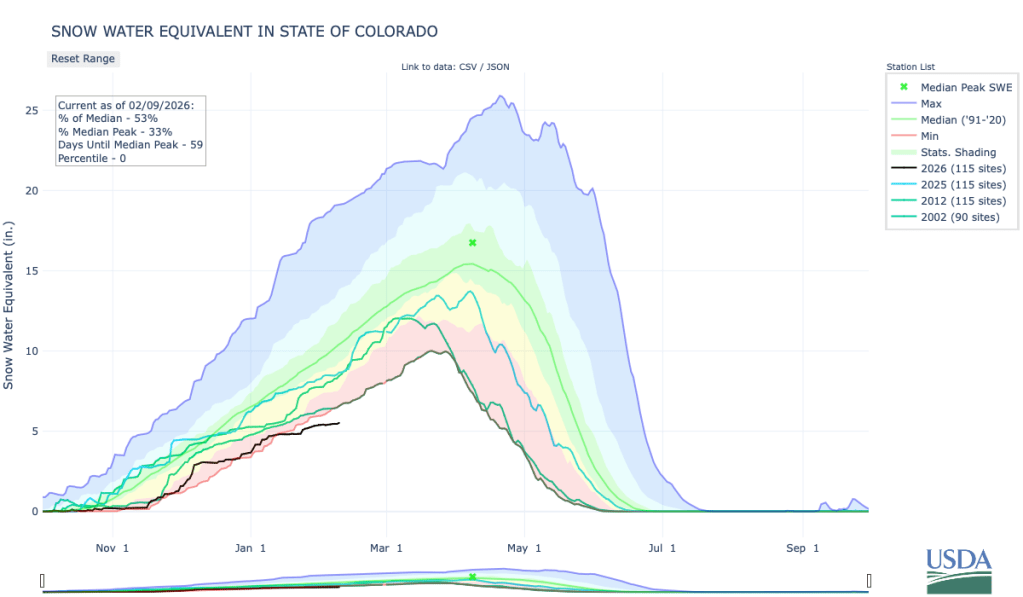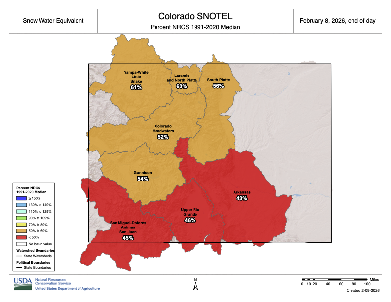 #Snowpack news February 9, 2026 Westwide SNOTEL basin-filled map February 9, 2026. Colorado snowpack basin-filled map February 9, 2026. Share this: Share on Bluesky (Opens in new window) Bluesky Share on LinkedIn (Opens in new window) LinkedIn Share on Facebook (Opens in new window) Facebook Email a link to a friend (Opens in new window) Email Print (Opens in new window) Print Share on X (Opens in new window) X Like this:Like Loading...