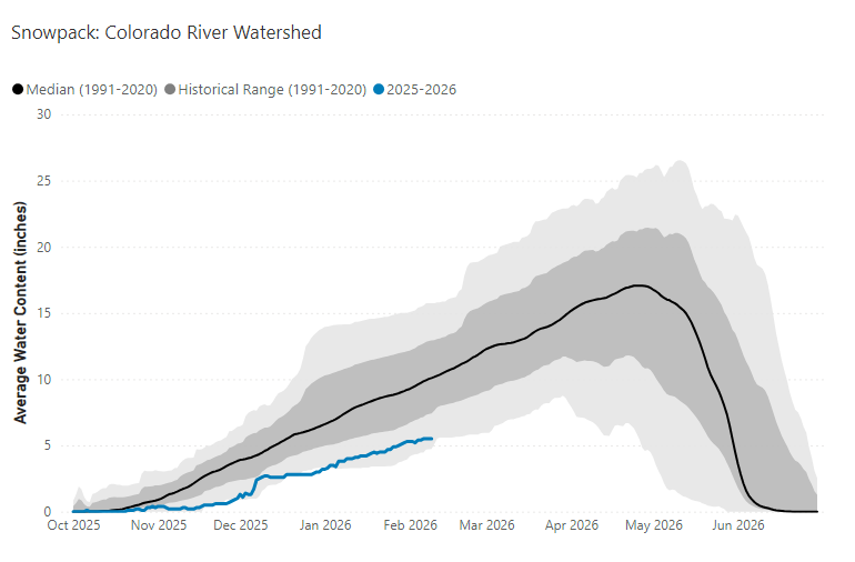 Snowpack as of Feb. 9, 2026, was near record lows: The Colorado River Basin within Denver Water’s collection system was at 55% of normal. The South Platte River Basin within Denver Water’s collection area was 42% of normal. In Denver Water’s decades of records for its watershed collection areas, as of Feb. 9, the Colorado River snowpack ranked among the worst, and the South Platte River snowpack ranked the worst.