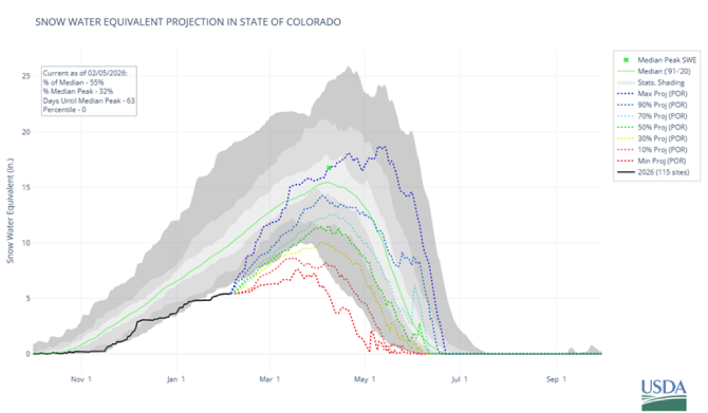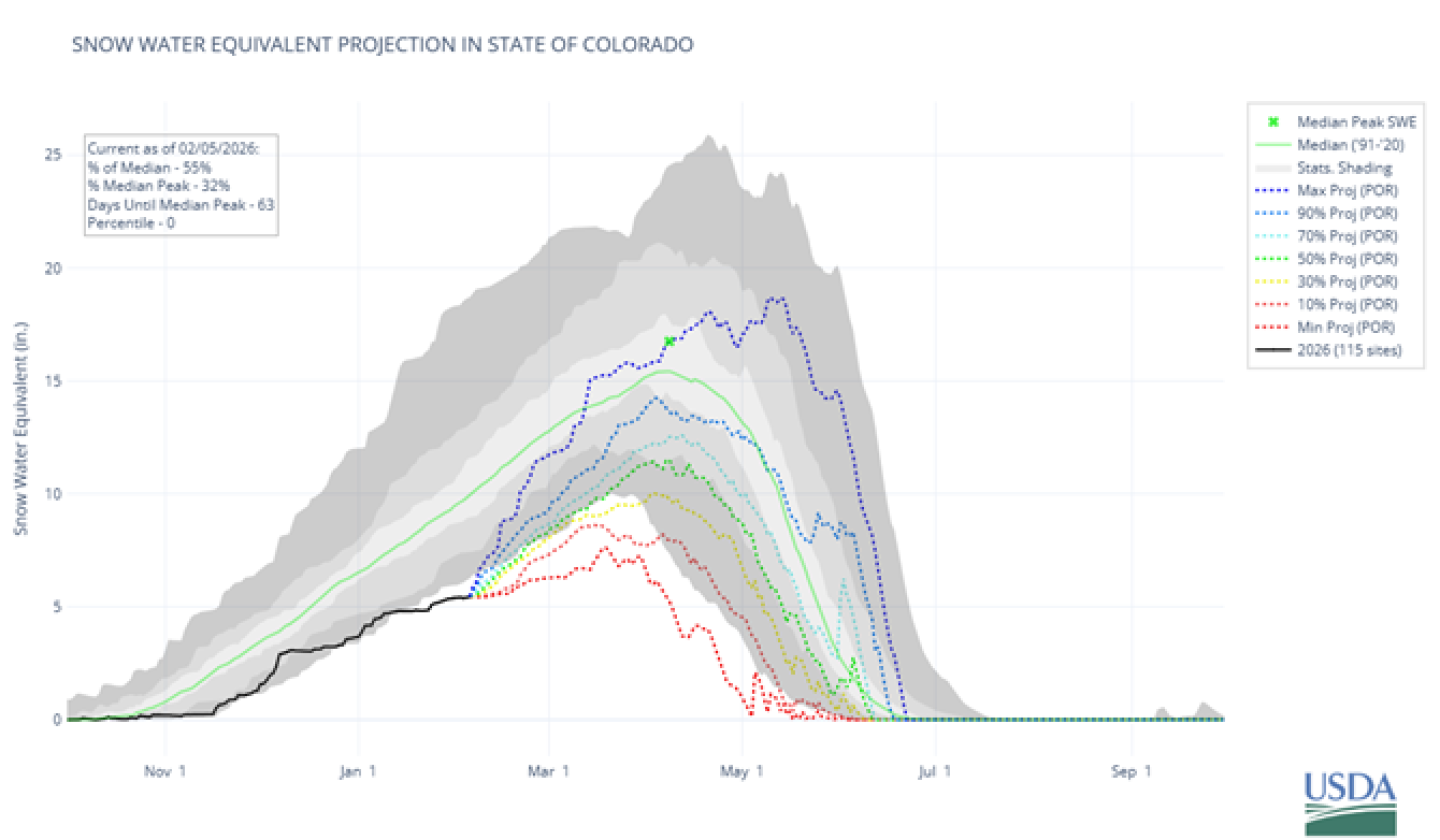 February 10th, 2026 – Warm and dry conditions persisted across Colorado during most of January, which has led to record low snowpack for much of the state. Every major river basin across Colorado received below normal precipitation in January, ranging from 58 percent of median in the Upper Rio Grande river basin to 76 percent of median in the Arkansas river basin. Although there were a series of storm systems during the first and last week of January which delivered snowfall across the state, this was not enough to improve overall conditions. Based on the 1991-2020 median, current statewide snow water equivalent (SWE) is 55 percent of normal, and ranges from 48 percent of normal in the Arkansas river basin to 64 percent of normal in the Laramie-and-North Platte river basin. Since January 13th, snowpack across Colorado has been at record low levels when compared to the 30-year normals, and with only a couple more months left in the typical snow accumulation season, it looks less likely that we will receive enough snowfall by April 1st to achieve normal peak SWE. It would take consistent, record-breaking snowfall for the rest of the season to reach normal peak SWE, and with the long-term outlooks, that is looking highly unlikely. Based on projection plots, even if the state receives average snowfall (50% projection) for the rest of the season, we would end up around 70 percent of median peak SWE (figure 1).