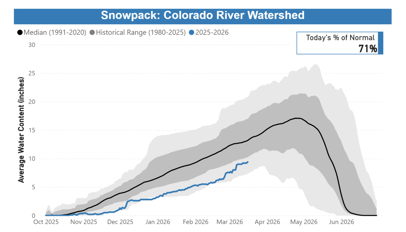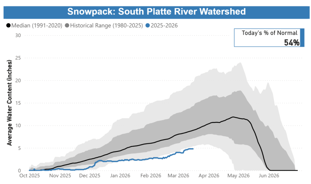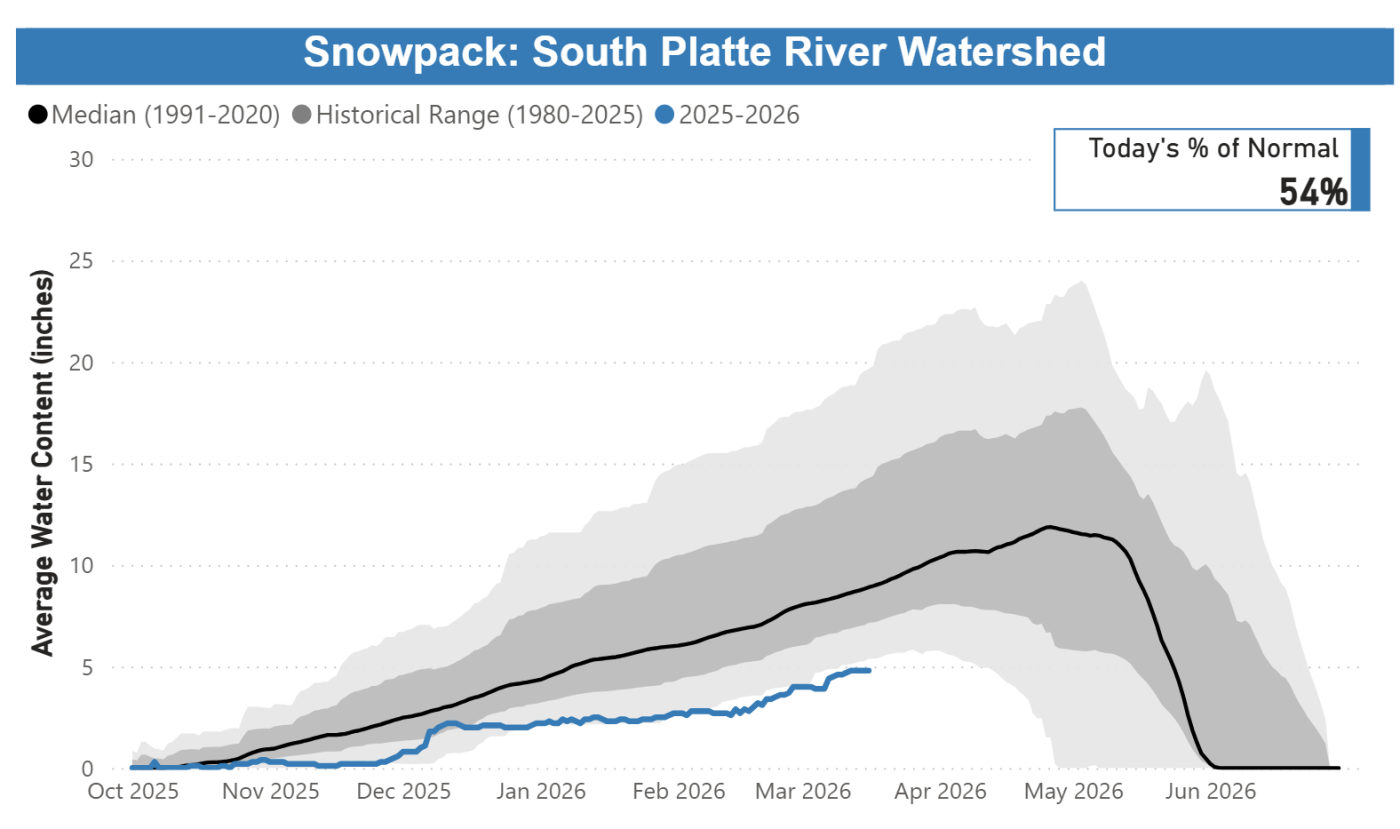 En 16 de marzo de 2026, el deshielo de la montaña se encontraba cerca de niveles históricamente bajos: La cuenca del río Colorado dentro del sistema de recolección de Denver Water estaba al 71 % de lo normal. La cuenca del río South Platte dentro del área de recolección de agua de Denver Water estaba al 54 % de lo normal. En las décadas de registros de Denver Water sobre sus cuencas hidrográficas de recolección, al 16 de marzo el deshielo de la montaña en la cuenca del río Colorado ocupaba el tercer peor lugar y el deshielo de la montaña en la cuenca del río South Platte ocupaba el peor de todos.