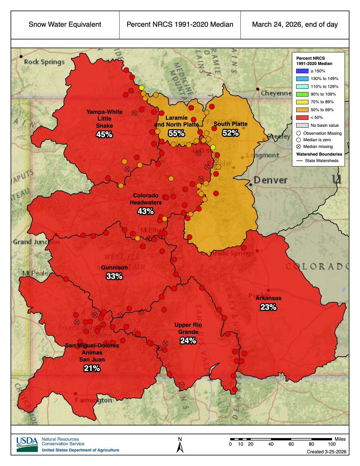 Per the latest US Drought Monitor, approximately 91% of the state is experiencing at least abnormally dry conditions, and ~74% of Colorado is experiencing drought (D1 or worse). Those numbers have increased from 54% and 45%, respectively, since the start of the water year on October 1, 2025. The recent warmth brought particularly large changes to the drought monitor last week, as Colorado’s exceptional drought or worse area (D3 or higher) nearly doubled from ~13% last week to ~24% in the latest drought monitor.