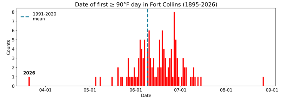 As you might expect, the kind of heat that we saw last week across Colorado is more typical of June or even July. In Fort Collins, the reading of 91°F on March 21 marked Fort Collins’s earliest 90°F or warmer day (the previous record was May 5, set back in 2000). On average, Fort Collins doesn’t see its first 90°F or warmer day until June 15: