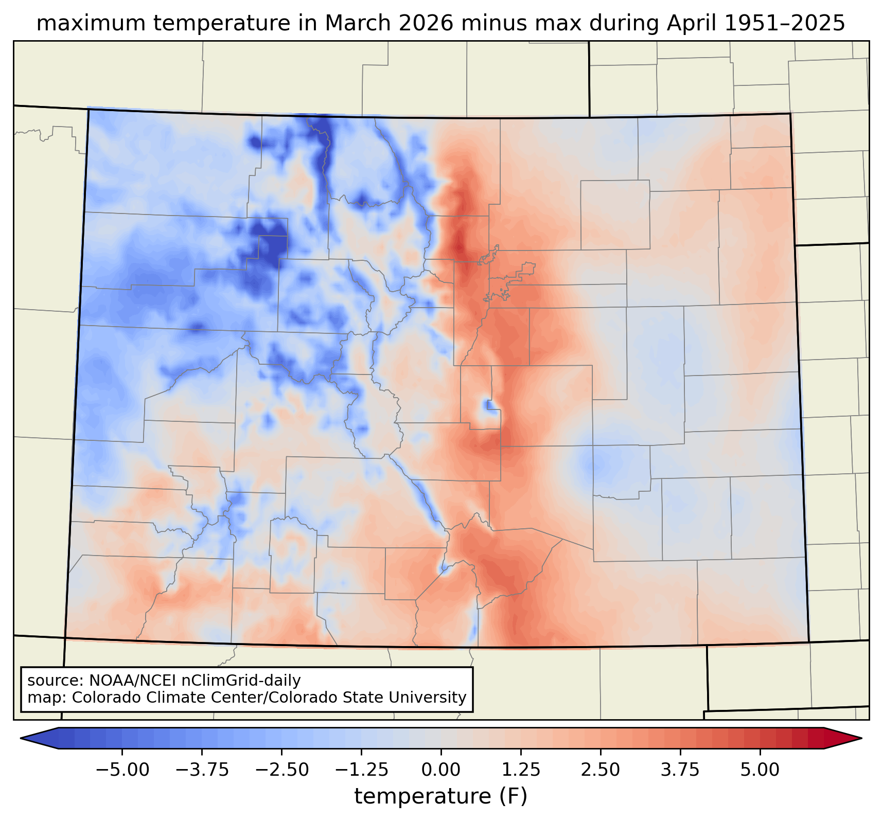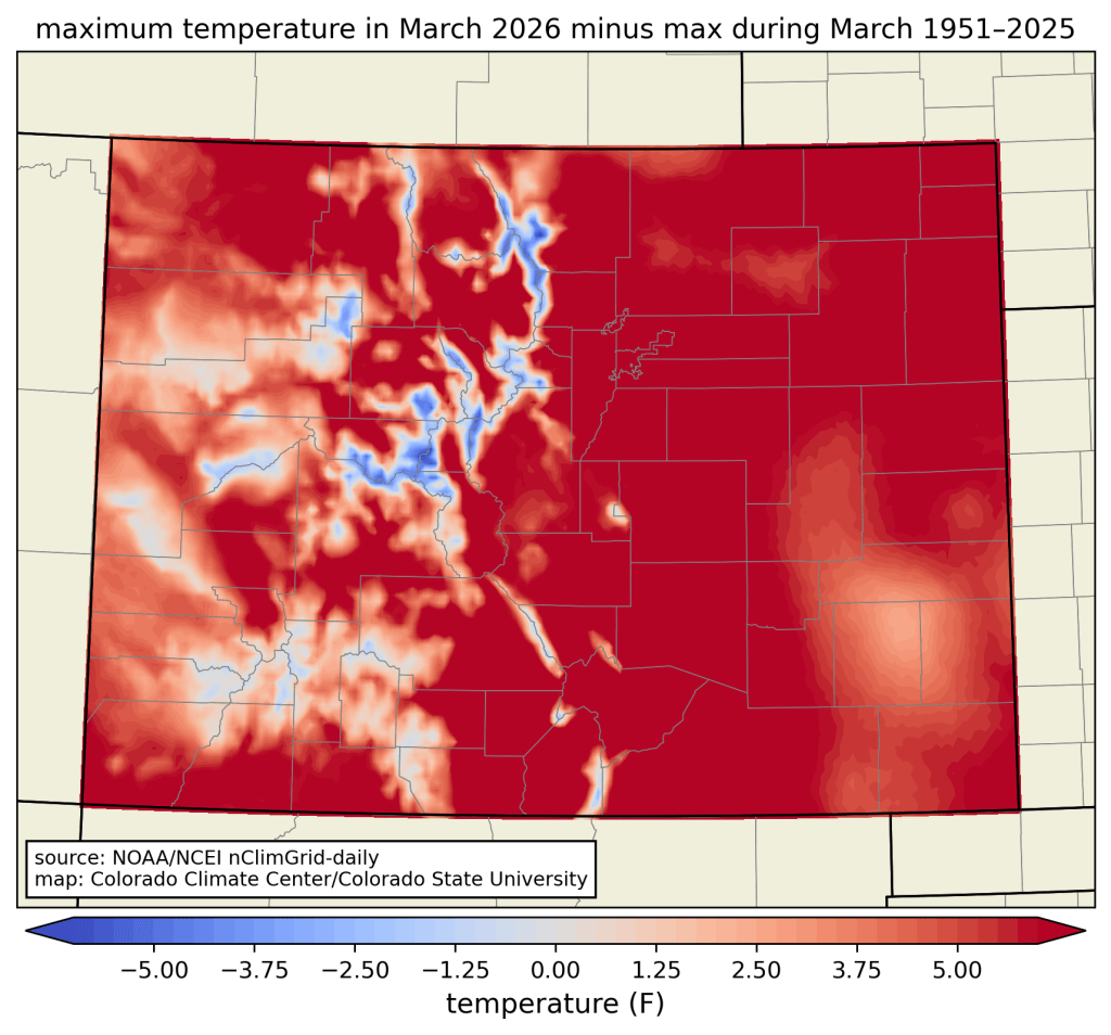 Another way of looking at this is by comparing the highest temperature observed this March (through the 22nd) to the highest temperature observed in all Marches from 1951—2025 in a gridded temperature dataset (in this case, NOAA’s nClimGrid). Nearly the entire state is red, meaning this March broke the previous record over this time period. (The main exception is at the highest elevations, where it was slightly warmer in March 1987.) Furthermore, most of the state saw temperatures at least 5°F higher than had previously been seen in March. The all-time March record for Colorado of 96°F at Holly in 1907 was not broken, but was tied at numerous locations including La Junta, Burlington, Campo, and Walsh.