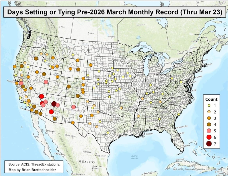 Last week’s heat was not only remarkable in terms of intensity but also longevity. The most significant heat occurred across four days (March 18-21). Over that period, several locations set new monthly records every one of those days, with each day being warmer than the last. This was a common theme throughout much of the western US: